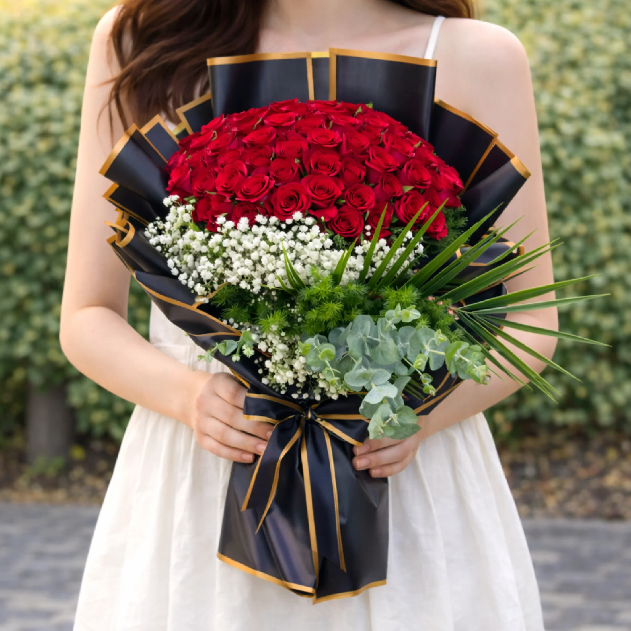 50 Kırmızı Gül Buketi, aşkı, tutkuyu ve derin bağlılığı en çarpıcı şekilde ifade etmek isteyenler için tasarlanmış özel bir çiçek aranjmanıdır. Yaklaşık 50 cm boyundaki bu zarif buket, siyah buket kağıdının modern ve şık duruşu ile kırmızı güllerin göz alıcı güzelliğini bir araya getirir. İçerisinde kırmızı güller, cipso, okaliptus ve fenix yaprağı gibi tamamlayıcı yeşillikler kullanılarak, hem dolgun hem de dengeli bir görünüm elde edilir. Kırmızı gül, yüzyıllardır aşkın ve romantizmin en güçlü sembolü olarak kabul edilirken; cipso masumiyeti ve saflığı, okaliptus ise ferahlığı ve tazeliği temsil eder. Bu sayede buket, hem duygusal hem de görsel açıdan zengin bir anlam taşır. 💐