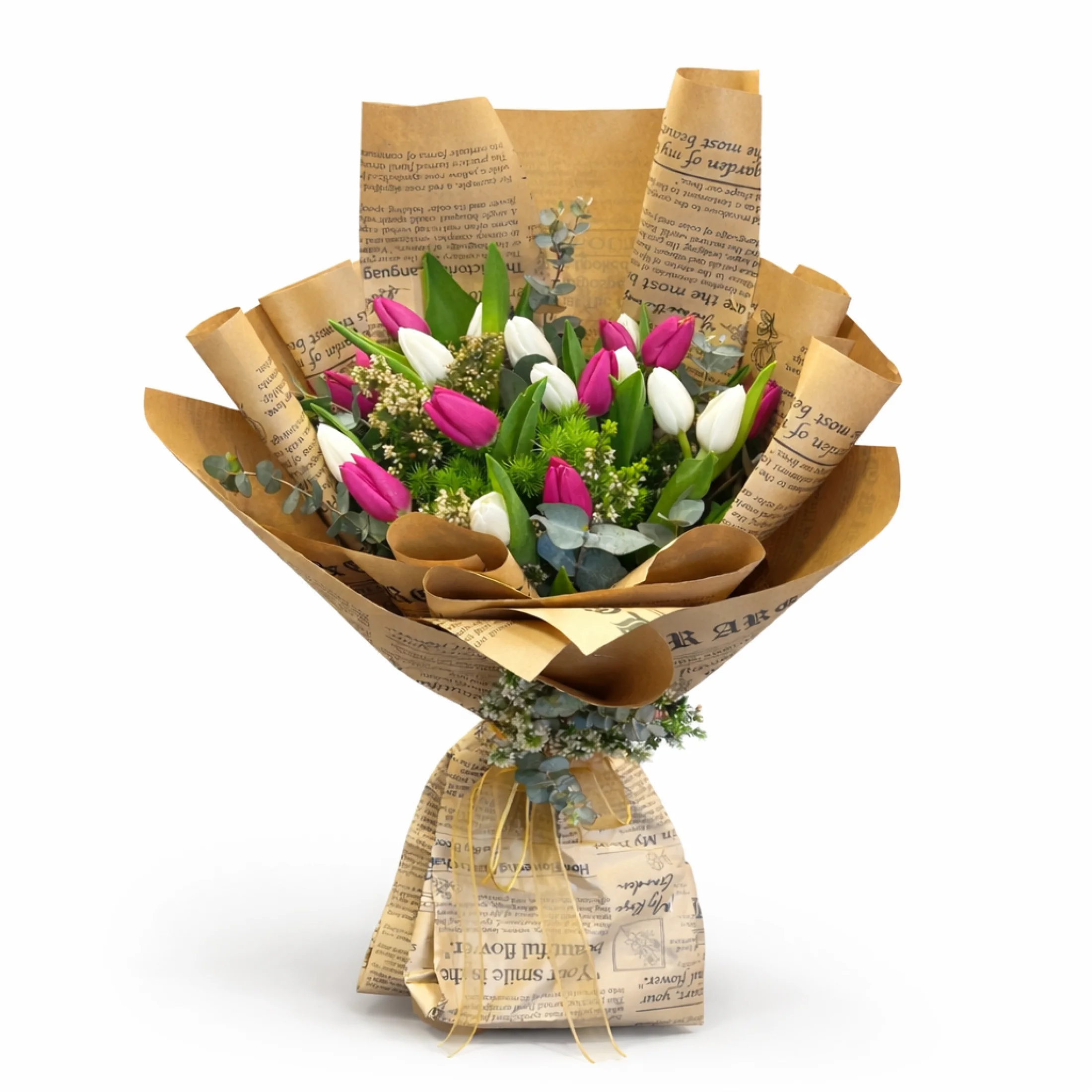 Zarafetin en saf hali… Bu özel lale buketi, 10 adet beyaz ve 10 adet pembe laleden oluşarak şıklık ve romantizmi tek bir aranjmanda buluşturur. Doğal dokusu ve uyumlu renk geçişleriyle hem göz alıcı hem de son derece zarif bir görünüm sunar.