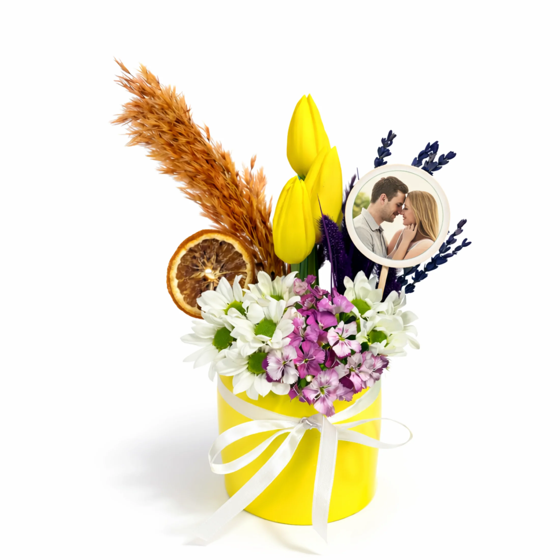 Enerjik renkleri ve modern tasarımıyla hazırlanan bu özel aranjman, sarı lale, beyaz papatya (krizantem), mor lavanta ve dekoratif kuru bitkilerle zenginleştirilmiştir. Canlı sarı silindir kutu içerisinde sunulan bu tasarım, doğal dokuların ve bahar renklerinin uyumunu yansıtır.