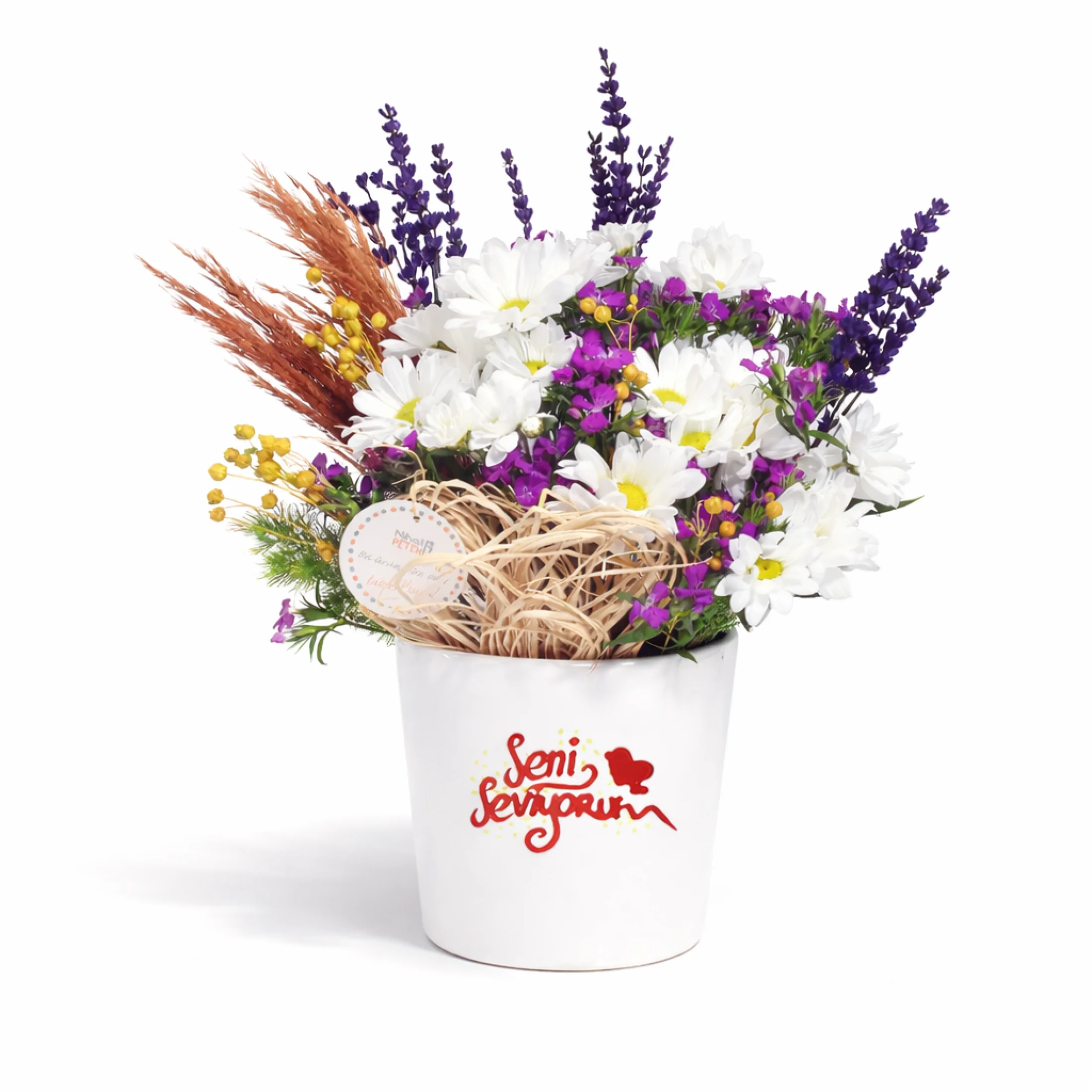 Ürünümüz beyaz seramik vazoda olup, içerisinde Beyaz papatya, hüsnüyusuf çiçeği, saman bitkisi, lavanta, pampas otu ve sarı luna ile süslenerek siz değerli müşterilerimiz için Adana Çiçek Tasarım Ekibimiz tarafından özenle ve sevgiyle hazırlanmıştır...