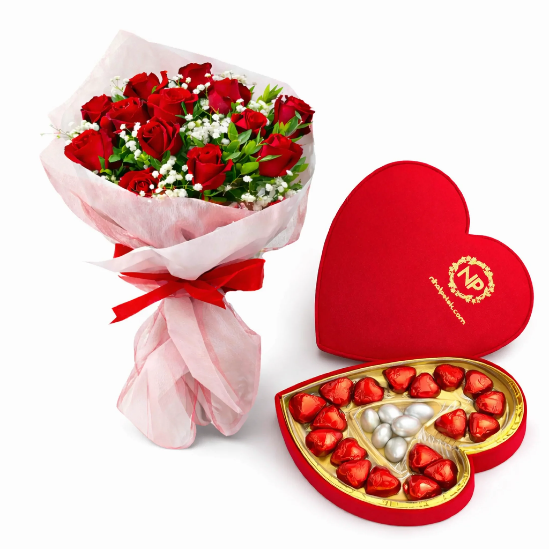 Özenle seçilmiş canlı kırmızı güller, cipso ve yeşilliklerle zenginleştirilerek şık pembe ambalaj içerisinde sunulur. Yanında gelen kalp tasarımlı kırmızı kutu ise özel kalp çikolatalar ve drajeler ile tamamlanmıştır.