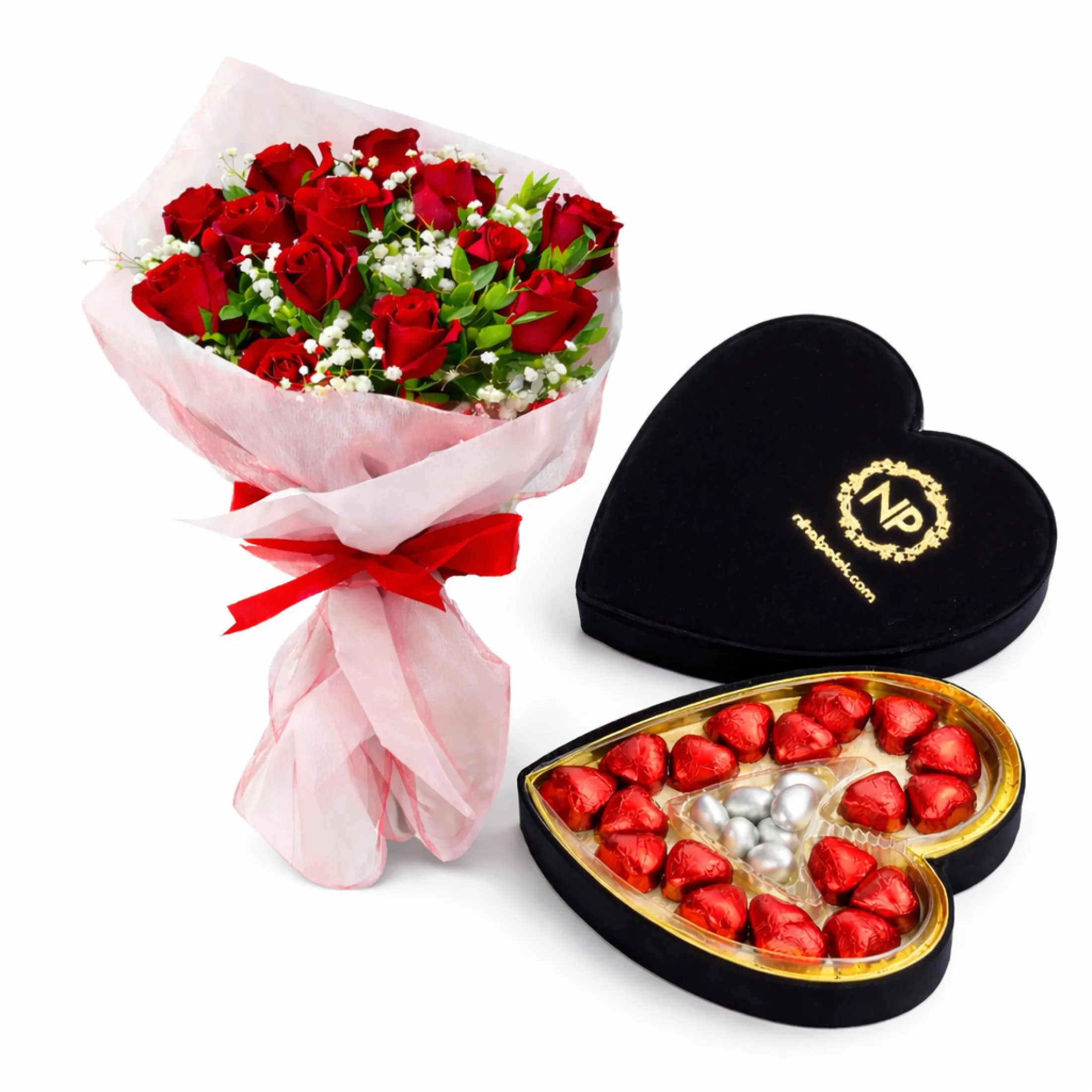 Bu özel tasarım sette, taze ve canlı kırmızı güller zarif cipso ve yeşilliklerle hazırlanmış buket formunda sunulur. Yanında ise kadife dokulu siyah kalp kutu içerisinde kırmızı kalp çikolatalar ve özel drajeler yer alır.