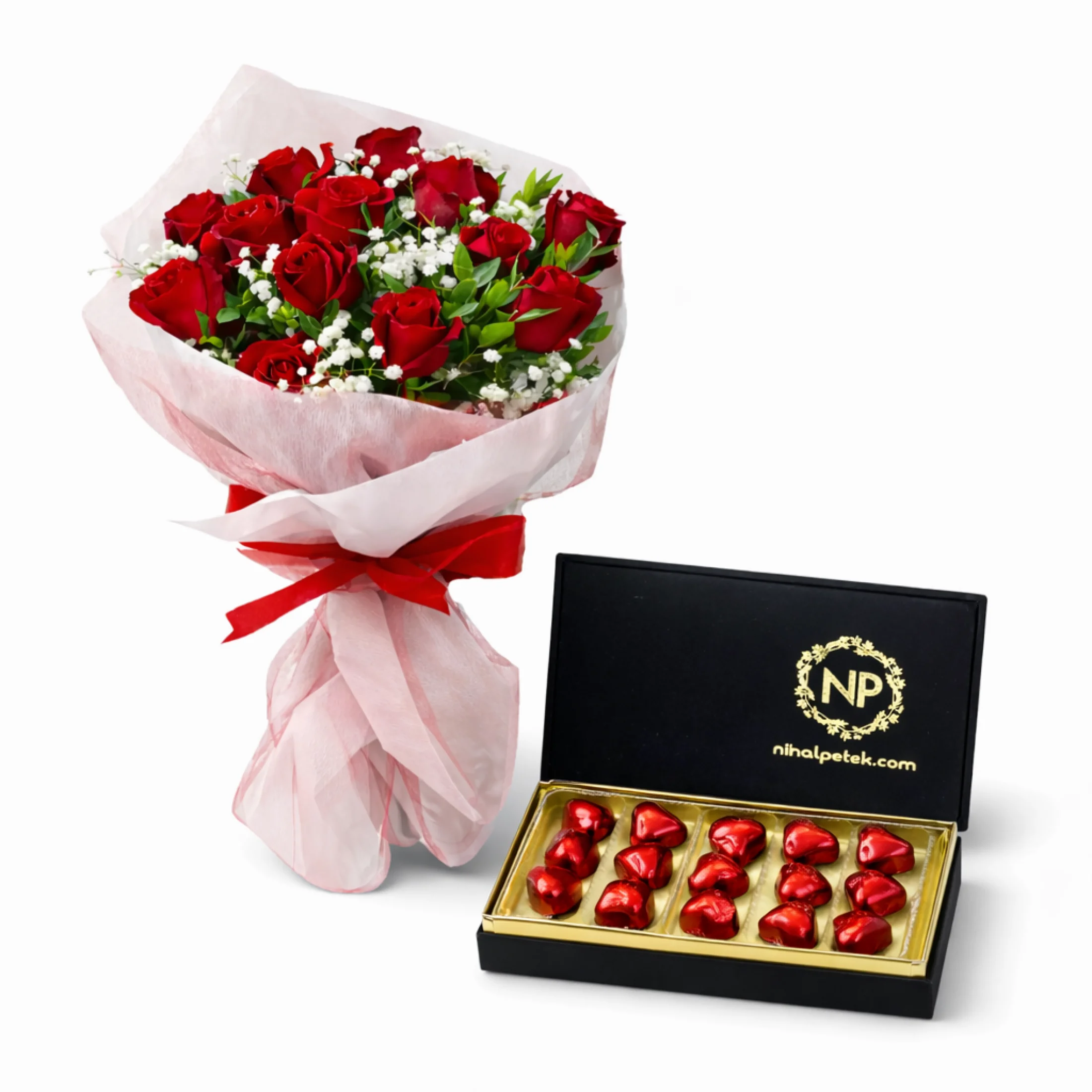 Aşkın en klasik ve en etkileyici hali… Kırmızı güllerin büyüleyici zarafeti ile kalp formunda özel çikolataların tatlı uyumu bir arada.