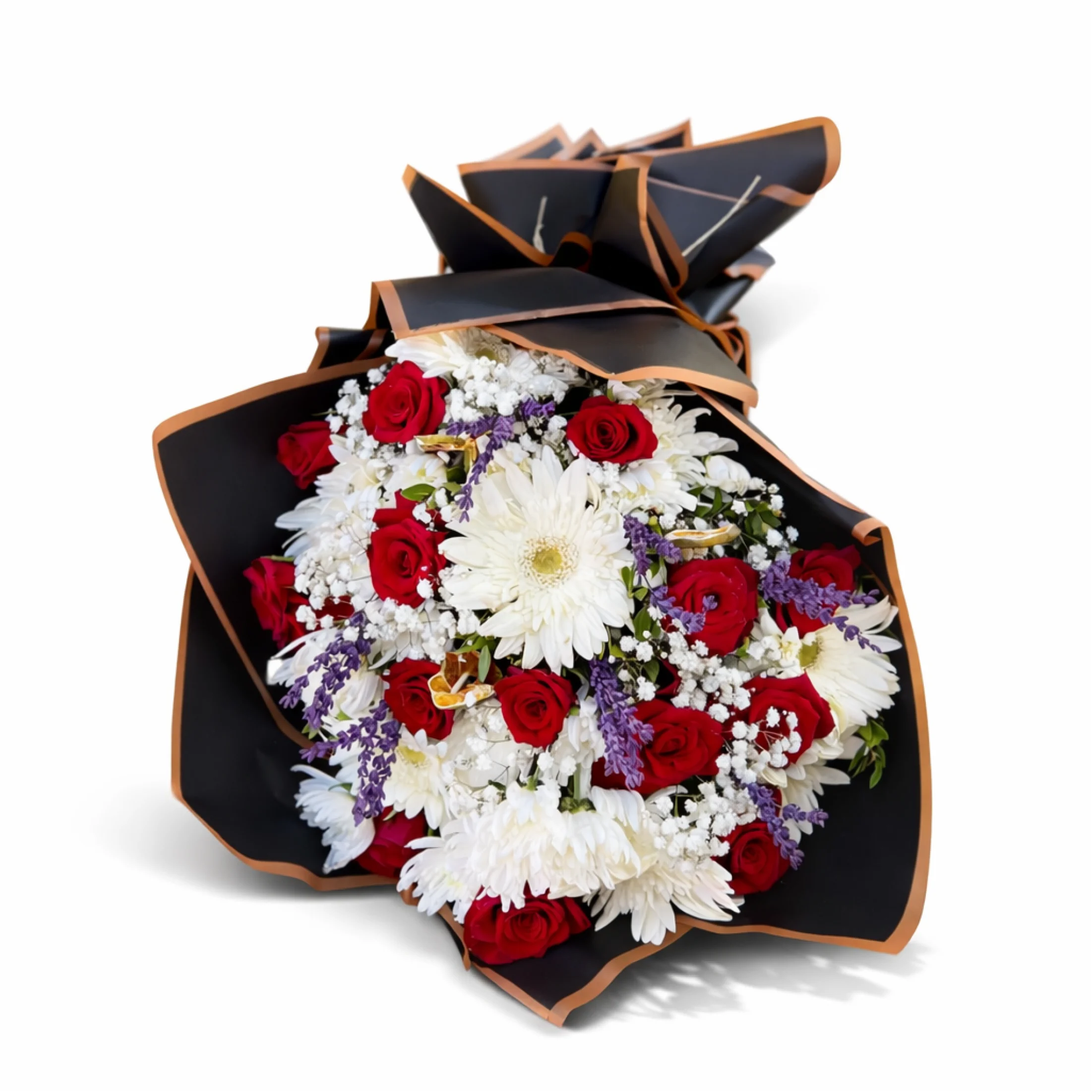 Bu kombinasyon, romantik bir hediye veya özel bir anı ifade etmek için kullanılabilecek güzel bir çiçek buketini oluşturur. Kırmızı güllerin tutkusu, beyaz papatyaların saflığı ve siyah kağıdın zarafeti bir araya gelerek anlamlı bir hediye sunar.