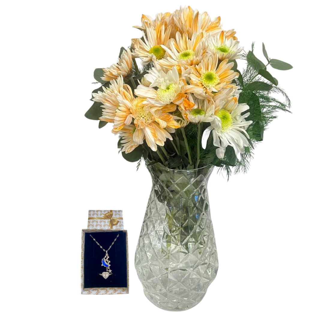 Turuncu kasımpatının sıcak ve enerjik tonları, okaliptusun ferah yeşili ve virgatüsün zarif dokusuyla birleşerek doğanın canlı enerjisini yansıtır. Kristal silindir cam vazo içinde özenle hazırlanan bu aranjman, hem zarif hem de modern bir duruş sergiler. Yanında yer alan ay kolye ve Pandora yüzük seti, romantizmi ve gizemli bir zarafeti temsil eder. Güneşin sıcaklığı ile ayın huzurunu bir araya getiren bu özel tasarım, sevdiklerinize anlamlı ve şık bir hediye alternatifi sunar.