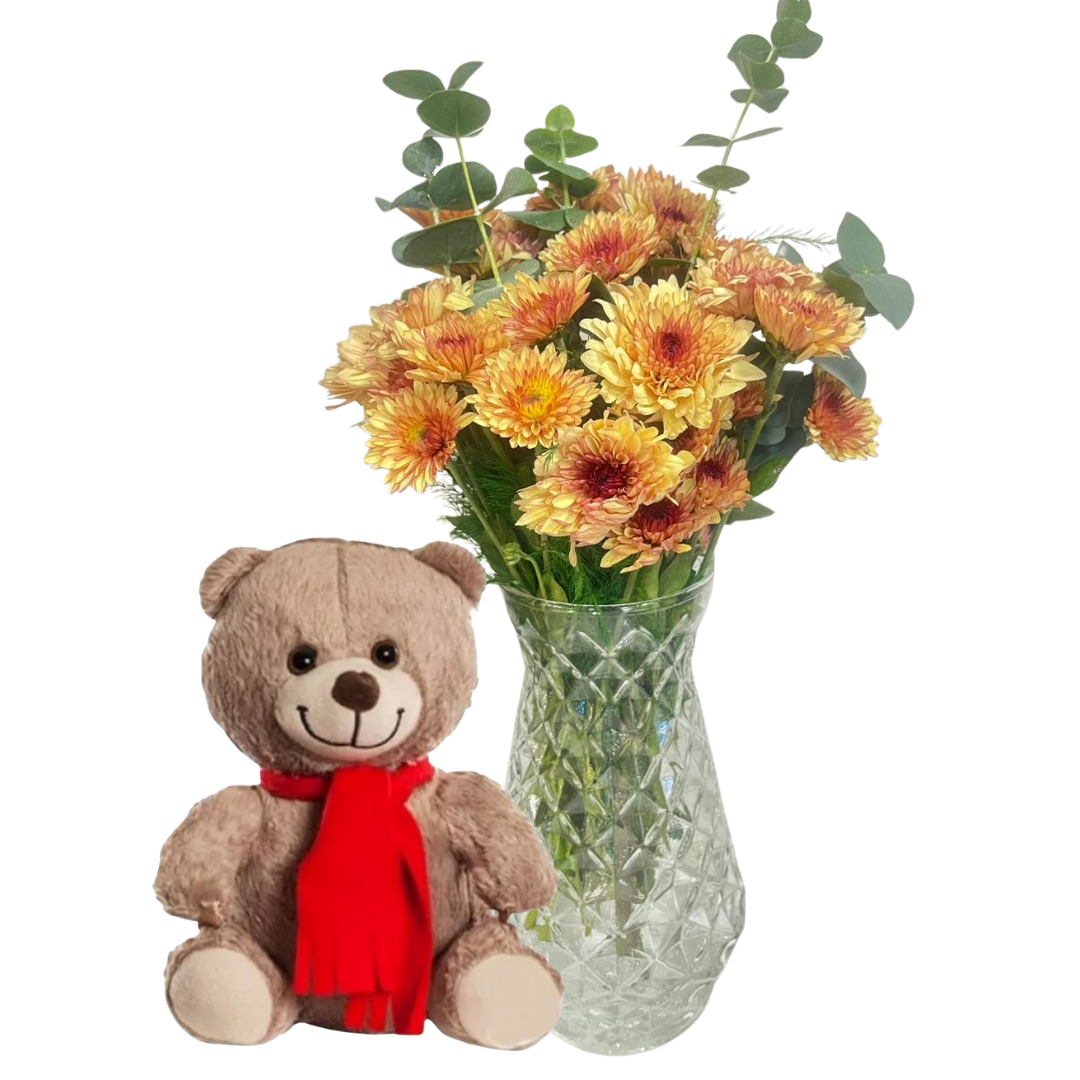 Krem rengi kasımpatının soft ve zarif tonu, okaliptusun ferah yeşilliği ve virgatüsün doğal dokusuyla birleşerek sakin ve estetik bir görünüm sunar. Kristal silindir cam vazo içinde özenle hazırlanan bu aranjman, bulunduğu ortama dinginlik ve sıcaklık katar. Yanına eklenen sevimli peluş ayıcık, tasarıma hem eğlenceli hem de içten bir dokunuş ekler. Hem neşe hem de duygusal bir hediye arayanlar için ideal bir seçimdir.