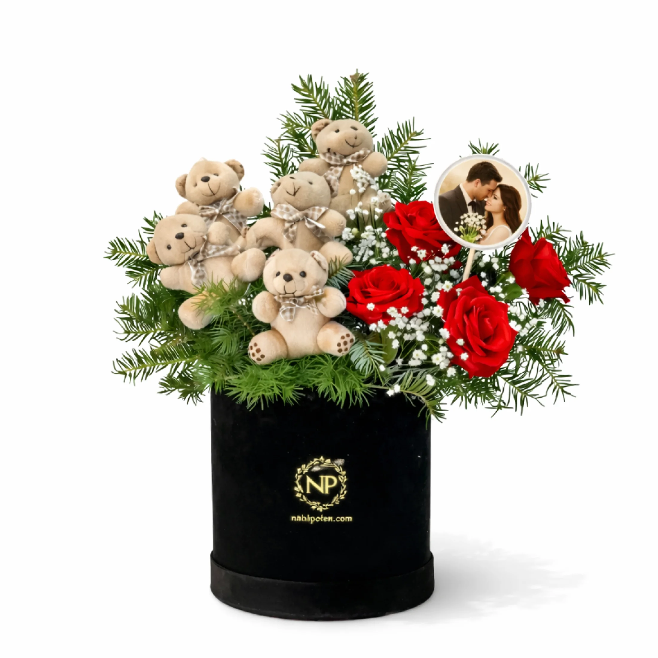 Aranjmanın içerisinde yer alan minik peluş ayıcıklar, çiçeğe sıcak ve sevimli bir dokunuş katarken hediyenizin unutulmaz olmasını sağlar. Çiçeklerin arasına yerleştirilen kişiye özel yuvarlak fotoğraf pankartı ise bu tasarımı çok daha özel hale getirir. İnce ahşap çubuk ile doğal şekilde çiçeklerin arasına yerleştirilen pankart, romantik bir çift fotoğrafı ile hazırlanarak hediyeye kişisel bir anlam kazandırır.