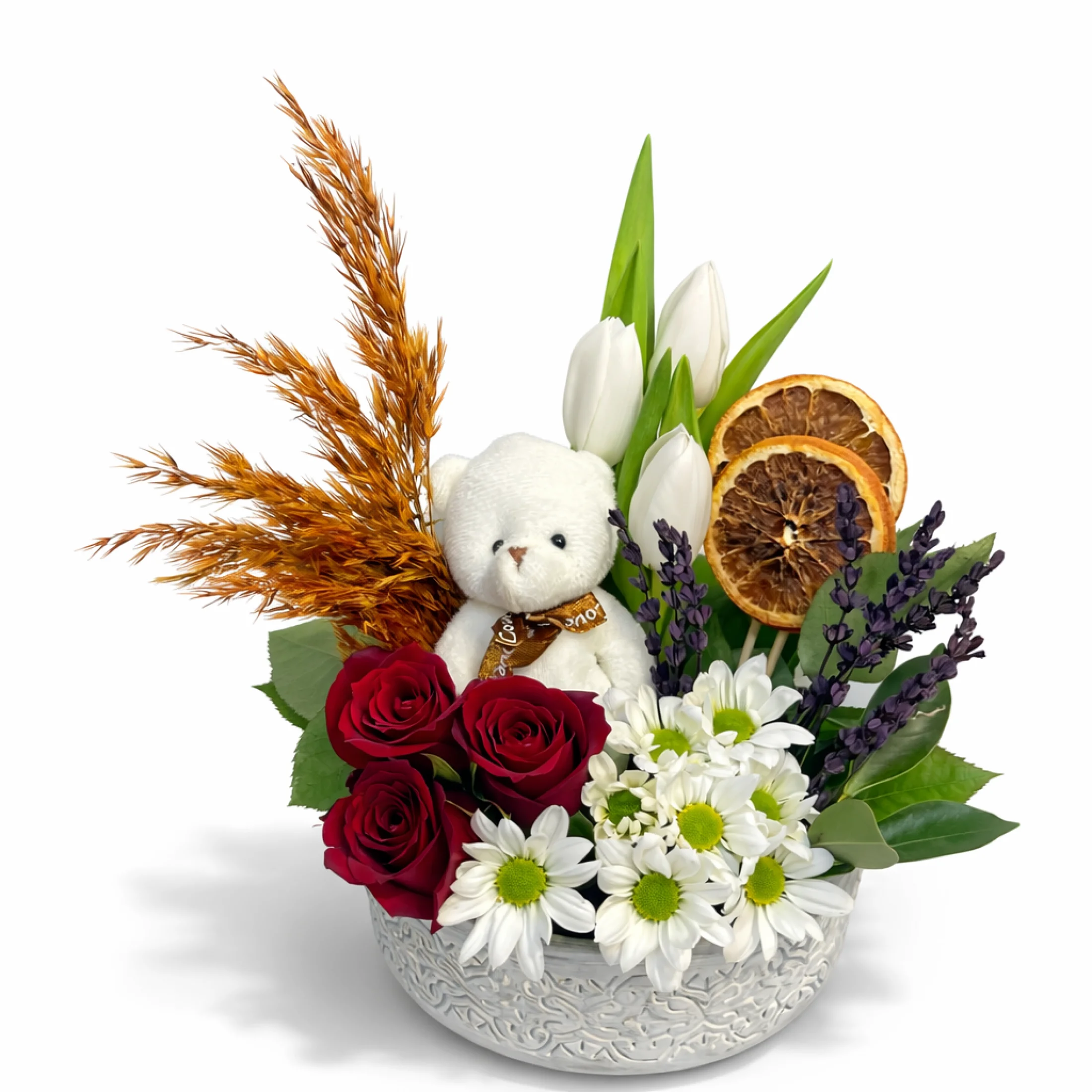 Sevgi dolu detaylarla hazırlanan Ayıcıklı Kırmızı Gül ve Papatya Aranjmanı, romantik ve sıcak bir hediye alternatifi sunar. Şık desenli seramik saksı içerisinde hazırlanan bu özel tasarımda kırmızı güllerin aşkı, papatyaların masumiyeti ve beyaz lalelerin zarafeti bir araya gelir. Sevimli peluş ayıcık ve doğal dekoratif dokunuşlar (lavanta, pampas ve kuru portakal) aranjmana farklı ve estetik bir görünüm kazandırır.