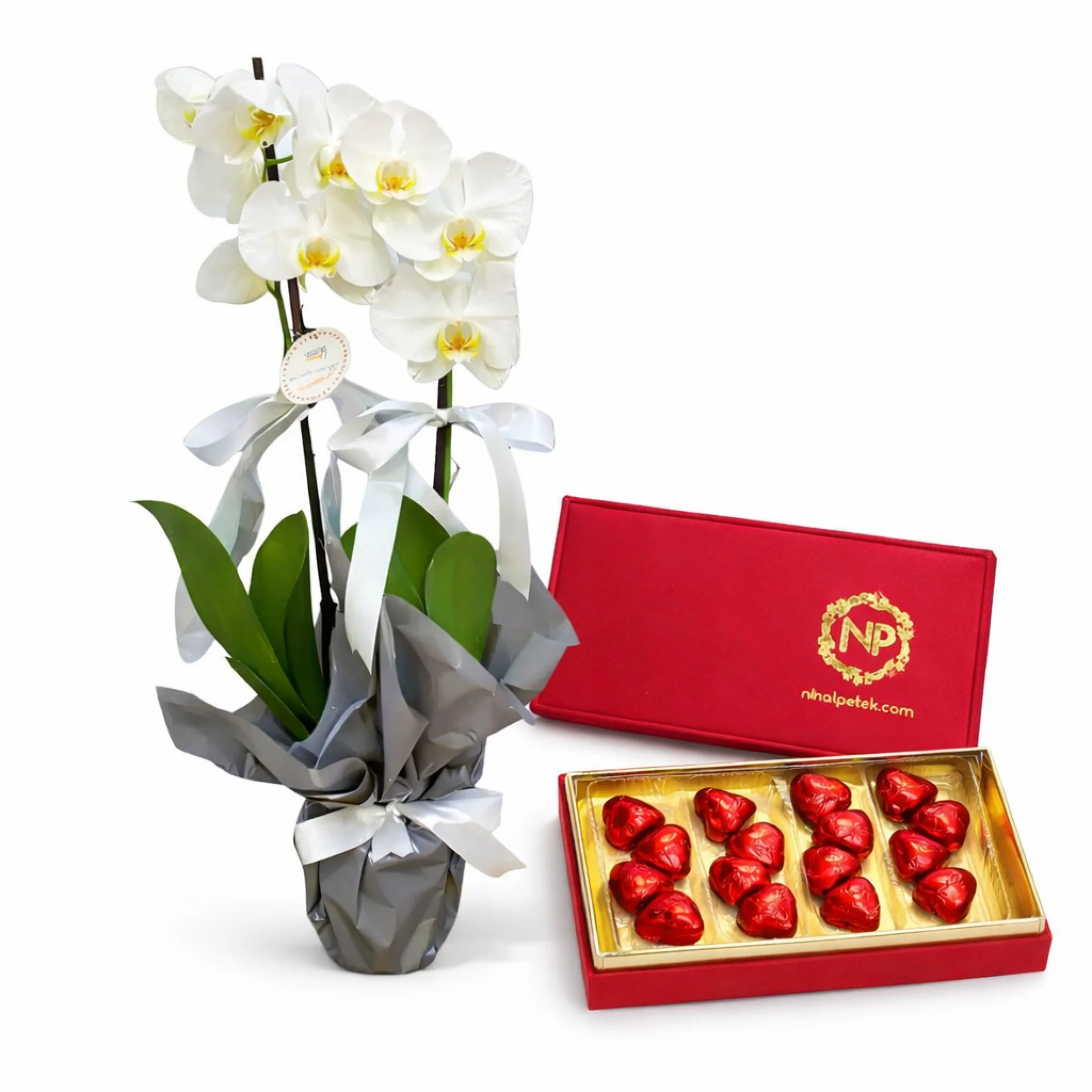 Saflığı temsil eden çift dallı beyaz orkide, aşkın en güçlü rengi kırmızı ile buluşuyor. Zarif ambalajı ve saten kurdele detaylarıyla sunulan canlı Phalaenopsis orkide; şık kırmızı premium kalp çikolata kutusuyla tamamlanarak etkileyici bir hediye setine dönüşür.
