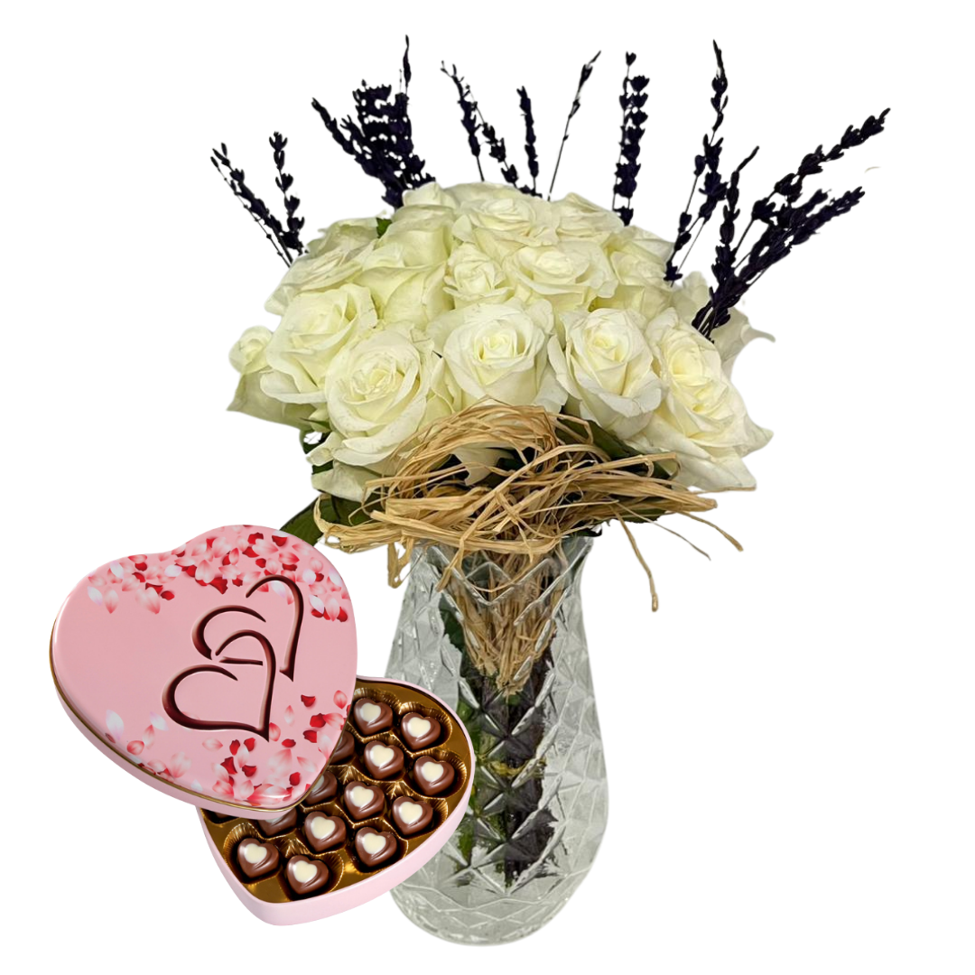 Beyaz güllerin zarif görünümü ile lavantanın doğal ve ferah kokusunu buluşturan bu özel aranjman, kristal silindir cam vazo içinde modern bir şıklık sunar. Beyaz güllerin saf duruşu ve lavantanın sakinleştirici etkisi, yanında yer alan teneke kalpli kutuda çikolata ile birleşerek hem romantik hem de şık bir hediye hâline gelir. Hem duygusal anlamı güçlü hem de zarif bir sunum arayanlar için ideal bir seçimdir.