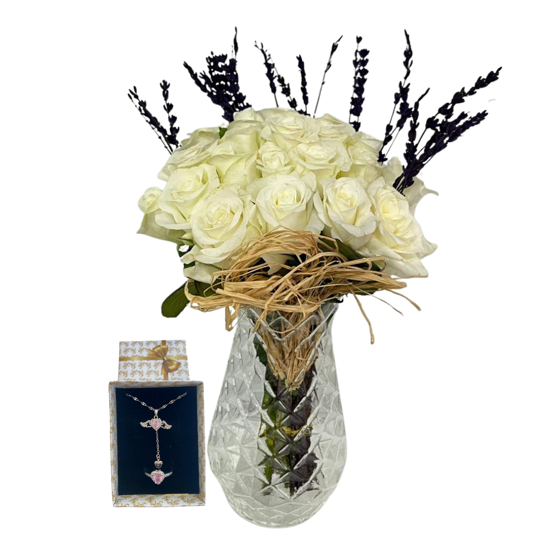 Şimdi bu özel aranjmanın yanında sadece melek kanatlı kolye ve yüzük seti bulunarak hediyeye sembolik, zarif ve duygusal bir anlam eklenmiştir