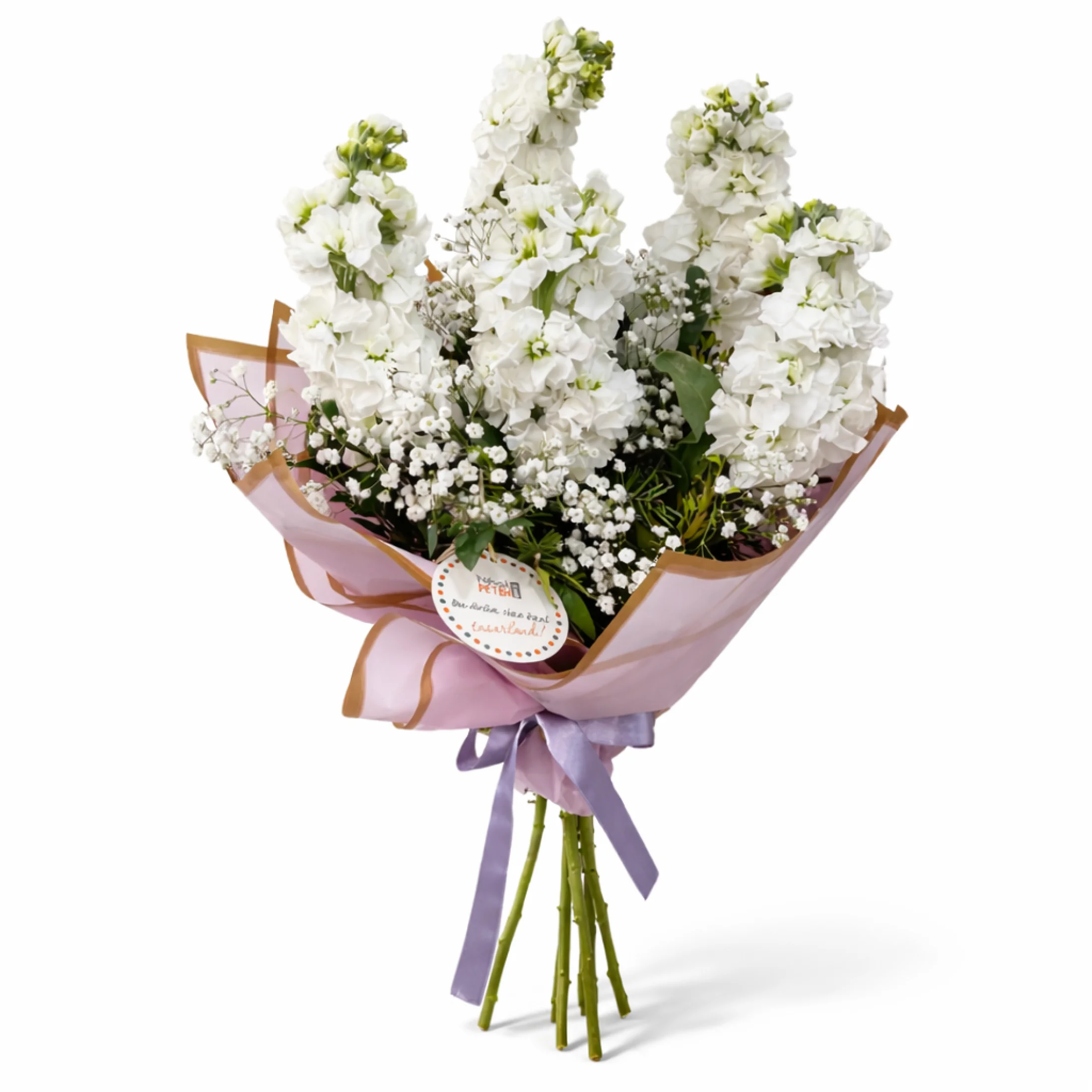 Şebboy çiçekleri, zarafetin, asaletin ve içten duyguların en güzel ifadesi olarak bilinir. Beyaz rengiyle saflığı, temiz duyguları ve yeni başlangıçları simgelerken; cipsolar narinliği ve ince ruhluluğu, mirkeladüs yeşillik ise tazelenmeyi ve canlılığı temsil eder. Pembe buket kağıdı, romantik ve sıcak bir hava katarken, saten beyaz kurdele bukete şık ve modern bir dokunuş ekler. Bir araya geldiklerinde, hem göze hem ruha hitap eden, dengeli ve zarif bir kompozisyon ortaya çıkar.