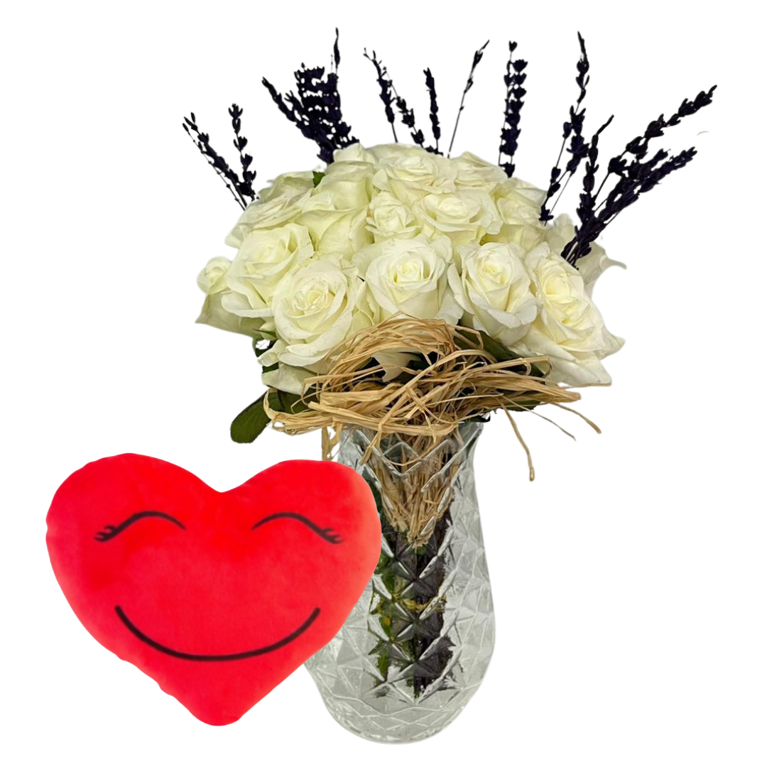 Beyaz güllerin zarif duruşu ve lavantanın doğal ferahlığını bir araya getiren bu şık aranjman, kristal silindir cam vazo içinde modern ve sade bir görünüm sunar. Saflığın simgesi beyaz güller ile huzur veren lavanta dalları, yanında yer alan kırmızı kalp yastık ile birlikte daha duygusal ve anlamlı bir hediye hâline dönüşür. Hem romantik bir jest hem de estetik bir dekor ürünü olarak dikkat çeker.