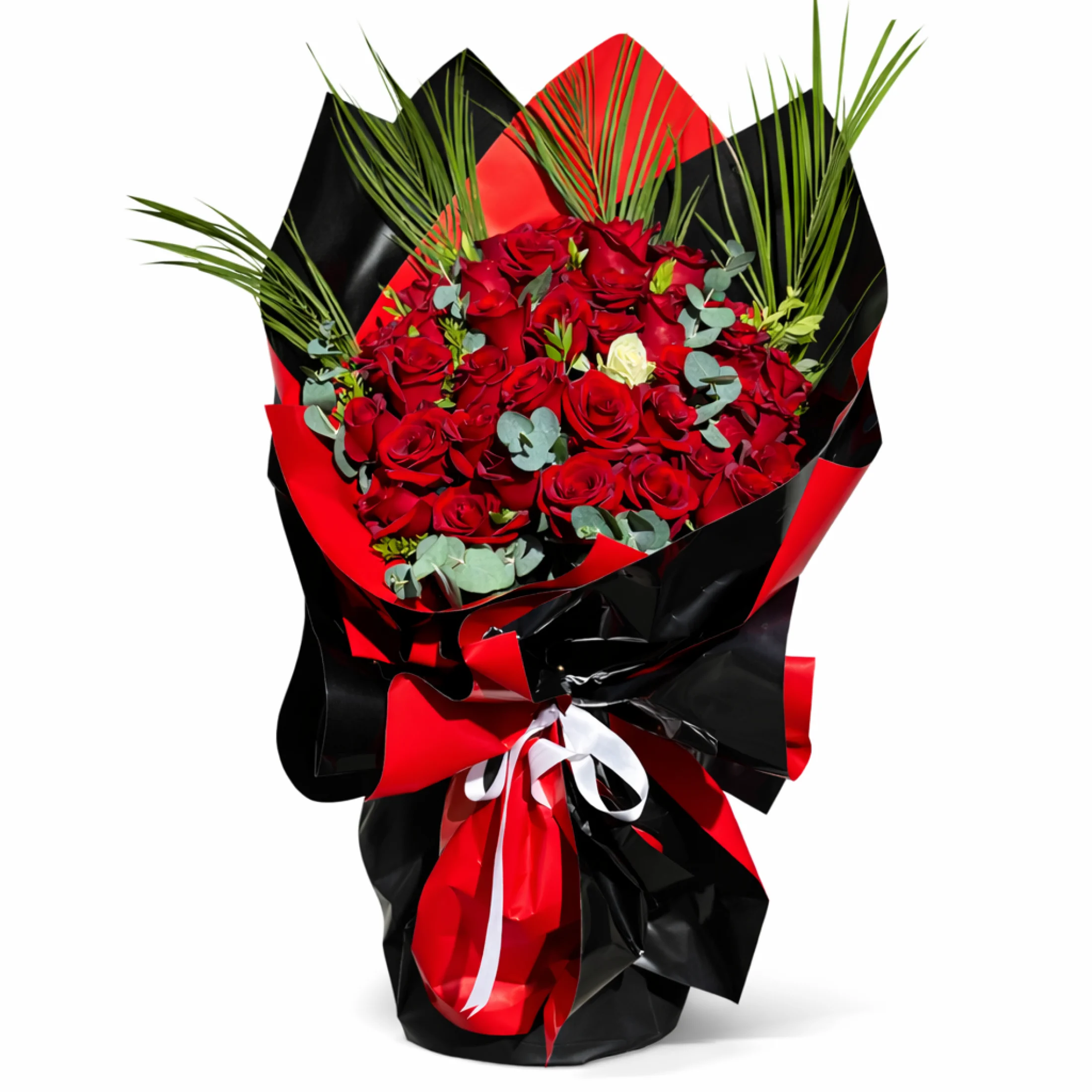 Beyazın Kırmızıya DokunuşuSiyah kırmızı buket kağıdında feniks yaprakları ile süslenmiş 40 adet kırmızı ve 1 adet beyaz gül el buketimiz sizler için tasarlandı.