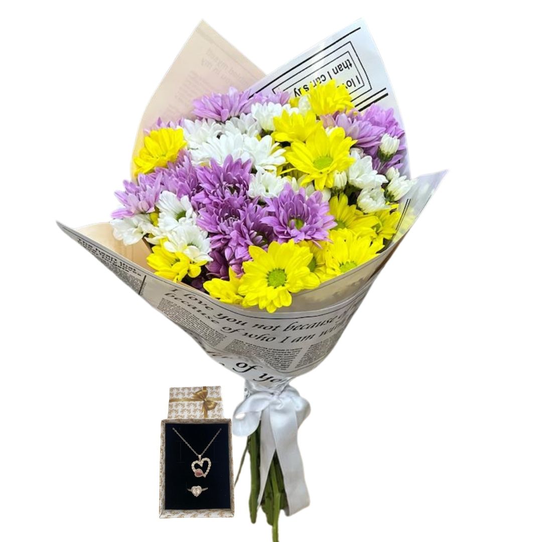 Aşkın sembolü kalp tasarımındaki Pandora kolye yüzük seti ile beyaz-sarı-pembe papatyaların romantik birleşimi, sevginizi en zarif şekilde ifade eder. Gazete kağıdı tasarımı ve saten beyaz kurdele detayları, hediyenin hem modern hem de özel görünmesini sağlar. En duygusal anları taçlandırmak için eksiksiz bir hediye.