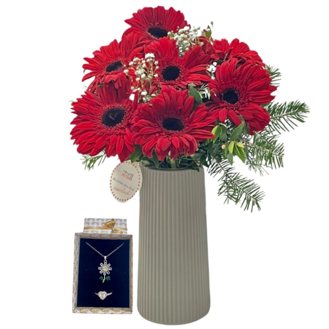 Mirkeladüs yeşilliğinin doğal görünümü ve bej plastik silindir vazonun sade yapısı, kırmızı gerberaların güçlü rengini daha da öne çıkarır. Cipso detayları çiçeğe hafiflik katarak aranjmanı modern ve canlı bir hale getirir. Bu etkileyici buketin yanında yer alan papatya temalı Pandora kolye ve yüzük seti, sadeliğin içtenliğini taşıyan özel bir dokunuş sunar. Şefkatli, samimi ve kalpten gelen duyguları zarafetle ifade etmek isteyenler için ideal bir hediyedir.