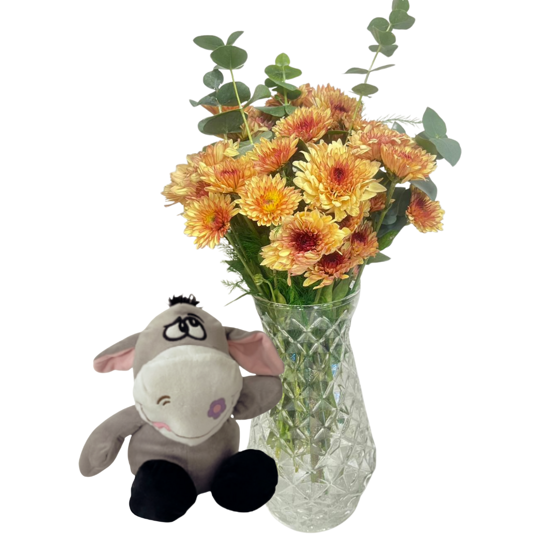 Krem rengi kasımpatının soft ve zarif tonu, okaliptusun ferah yeşilliği ve virgatüsün doğal dokusuyla birleşerek sakin ve estetik bir görünüm sunar. Kristal silindir cam vazo içinde özenle hazırlanan bu aranjman, bulunduğu ortama dinginlik ve sıcaklık katar. Yanına eklenen peluş eşek, tasarıma eğlenceli ve sevimli bir dokunuş ekler. Hem neşe hem de duygusallık taşıyan bu özel tasarım, sevdiklerinize anlamlı ve keyifli bir hediye sunar.