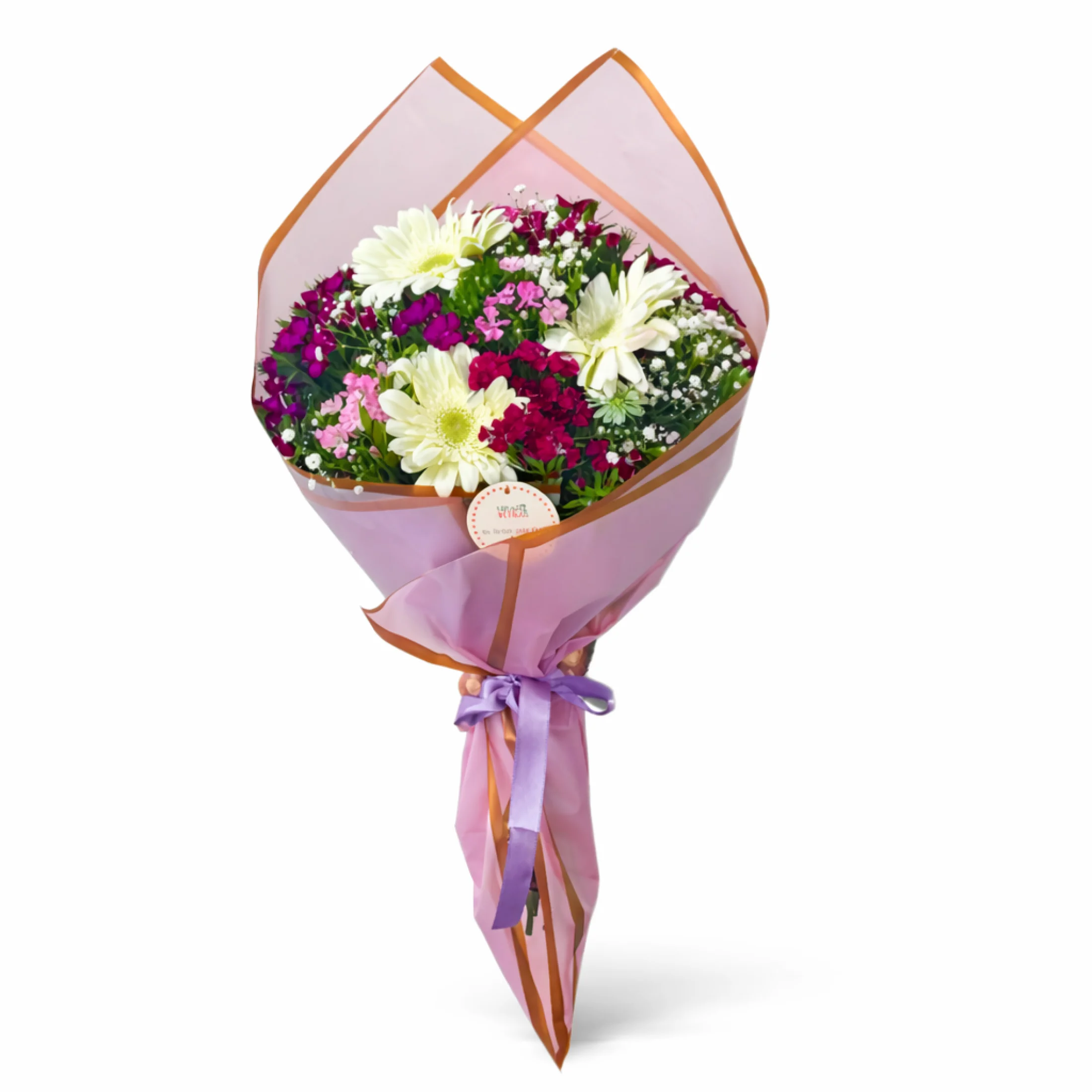Pembe buket kağıdı, çiçekleri nazikçe sararak pembenin içindeki romantizmi ve zarafeti vurguluyor. Bu dokunuş, duygusal bir bağın ve sevgi dolu bir atmosferin yaratılmasına katkıda bulunuyor.