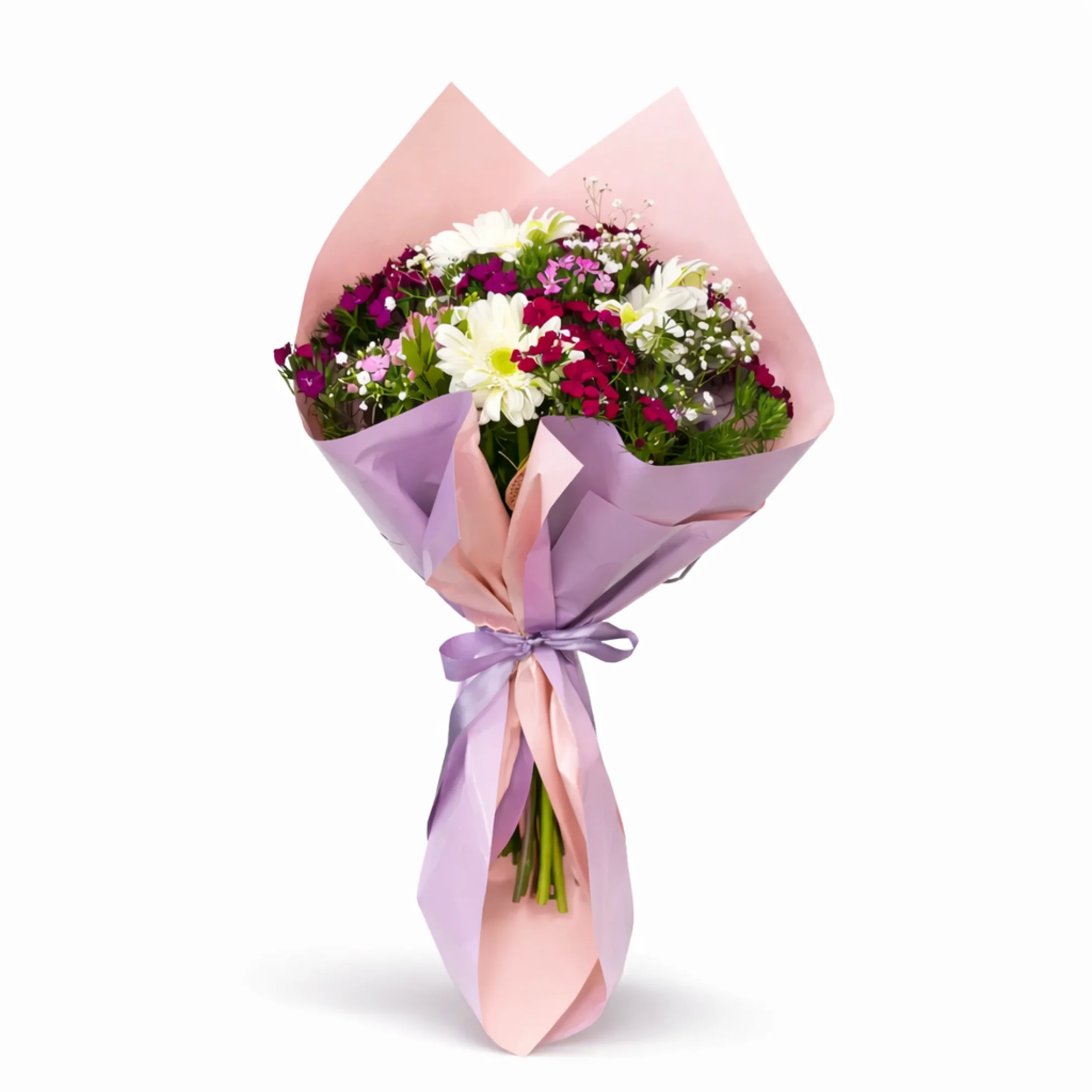 Çiçekler, mor pembe buket kağıdında özenle düzenlenmiş ve renklerin uyumuyla bütünleşmiştir. Bu düzen, buketin masalsı atmosferini vurguluyor.