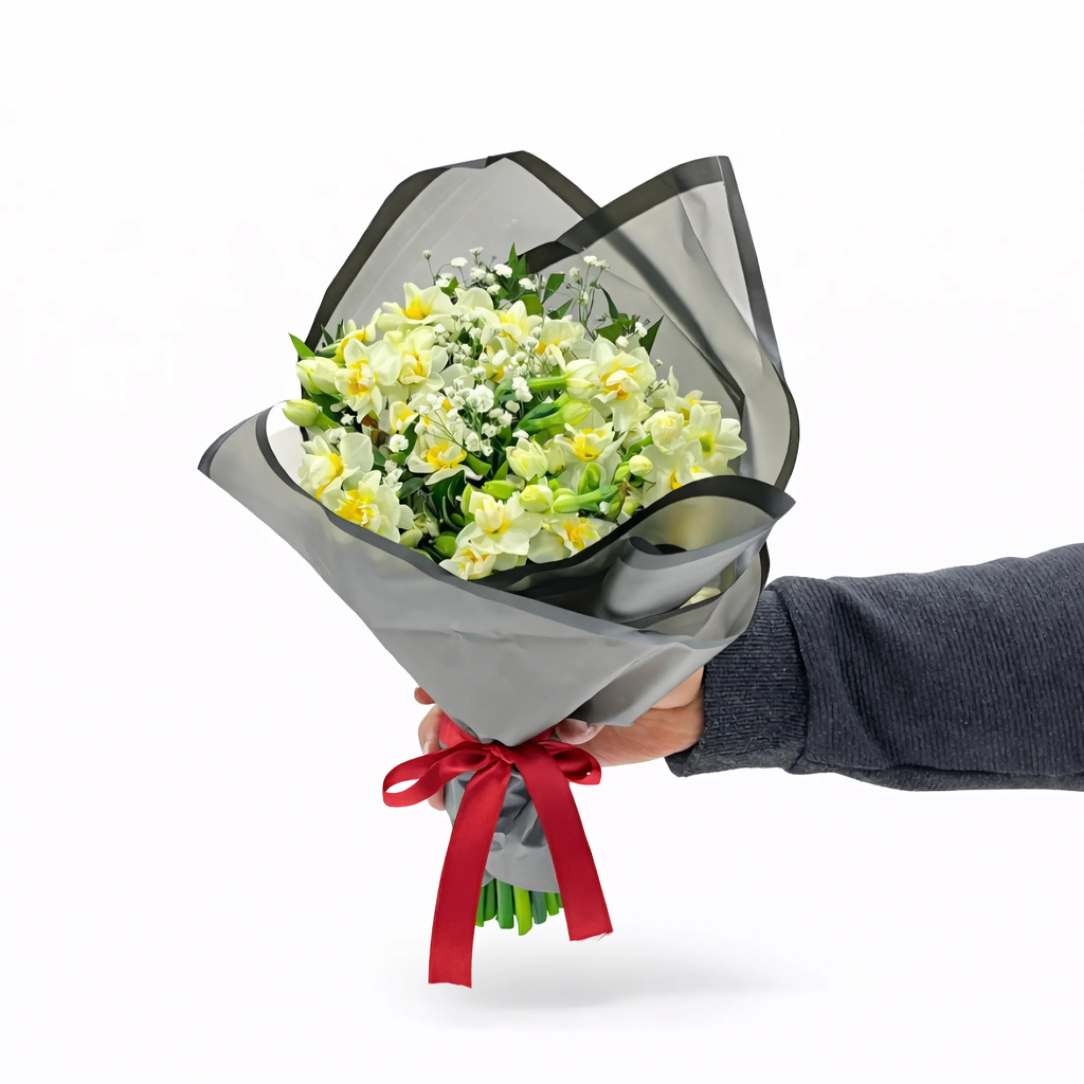 Bu siyah şeffaf buket kağıdı içindeki el buketi, zarafeti ve gizemi bir araya getiriyor. Siyah rengin asaleti ve şeffaf dokusu, buketi bir sanat eseri gibi sarıyor. İçerisinde nergis çiçekleri ise tazelikleri ve zarafetleriyle adeta dans ediyor.