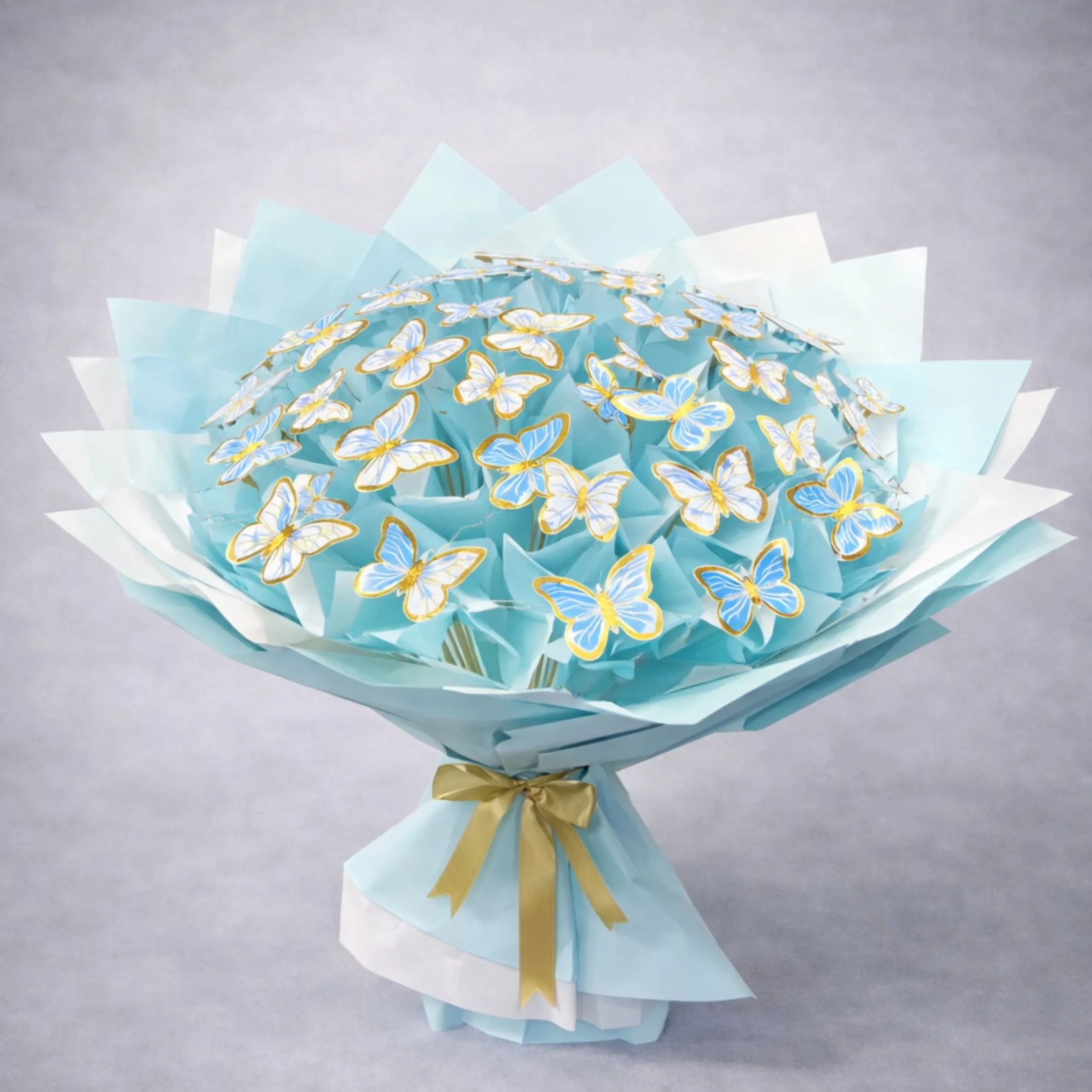 Her bir kelebek figürü, buketin formunu bozmayacak şekilde özenle yerleştirilmiş; soft mavi ve beyaz ambalaj kâğıtları ile katmanlı, dolgun ve estetik bir görünüm elde edilmiştir. Altın renkli kurdele ile tamamlanan tasarım, modern ve premium bir duruş sergiler.