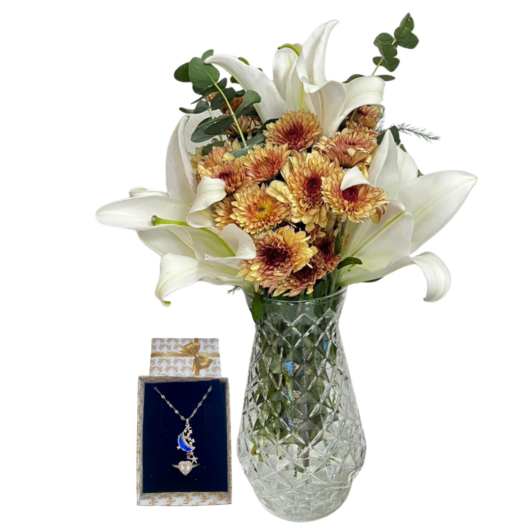 Krem rengi kasımpatılar ve beyaz lilyumlar, okaliptus ve virgatüs dallarıyla doğal bir uyum içinde sunuluyor. Kristal silindir cam vazoda özenle hazırlanmış bu aranjman, sade ve zarif bir görünüm sağlıyor. Yanına eklenen ay kolye ve Pandora yüzük seti, hediyenize mistik ve şık bir dokunuş katarak özel anları daha anlamlı hale getiriyor.