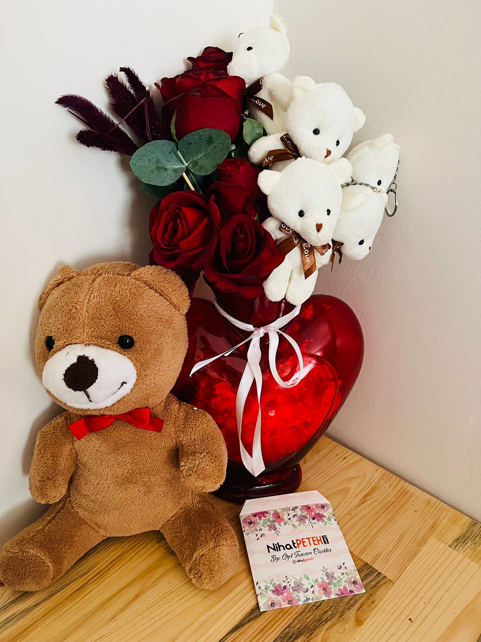 Sevginizi yansıtan özel tasarım kırmızı kalp cam vazo. Kalp şekli, duygusal bir atmosfer yaratmak için mükemmel bir seçenek olacaktır. Sevimlilikte zirve yapan 8-10 cm boyundaki peluş ayıcık anahtarlıklar,sevimliliği ve zarafeti bir araya getirdi.