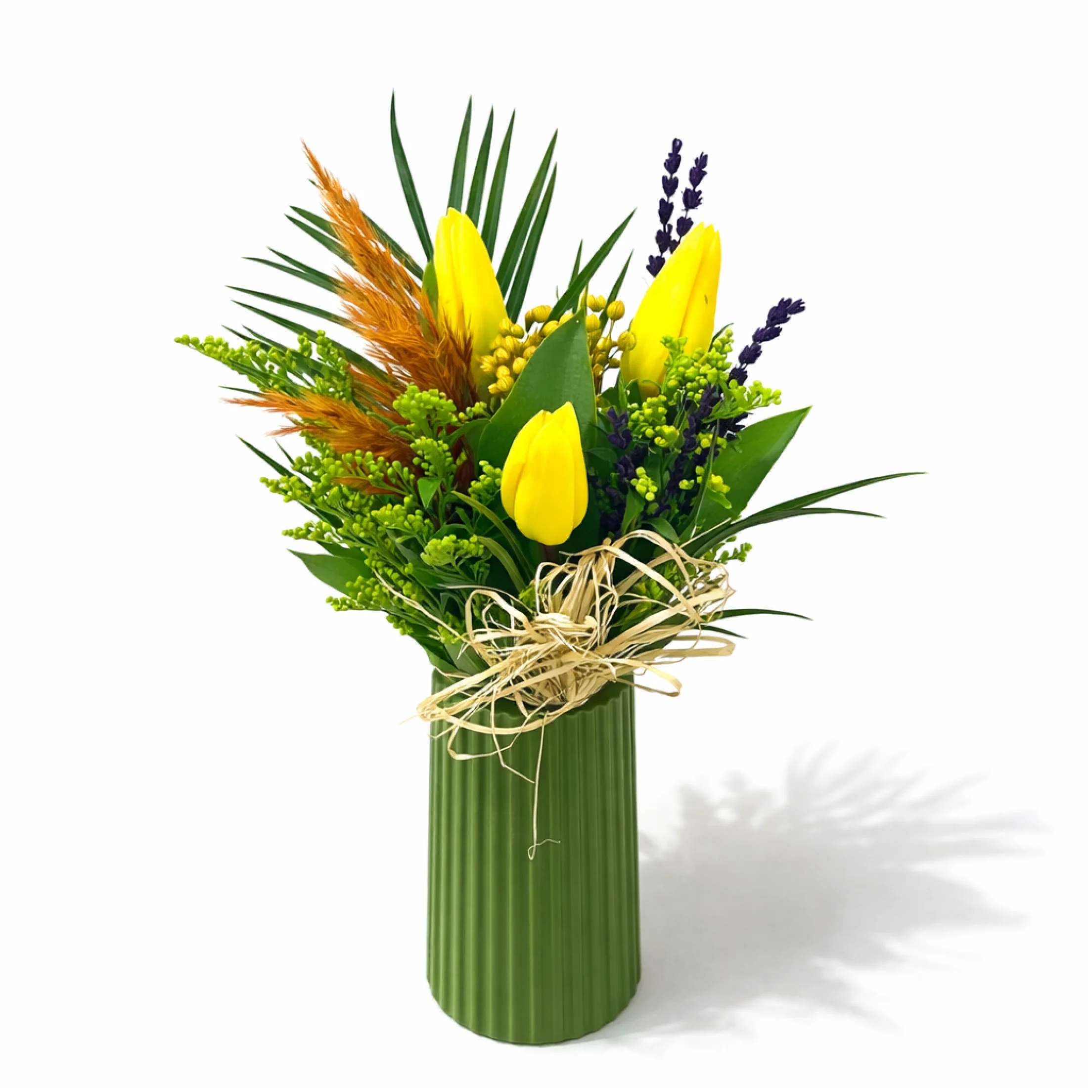 Doğallığı ve zarafeti bir araya getiren bu özel aranjman, sarı lalelerin canlı enerjisiyle hazırlanmıştır. Modern çizgilere sahip dekoratif vazoda sunulan tasarım; sarı laleler, lavanta dokunuşları, dekoratif kuru başaklar ve zengin yeşilliklerle tamamlanarak doğal ve şık bir görünüm oluşturur. Rustik rafya detayı aranjmana sıcak ve samimi bir hava katar.