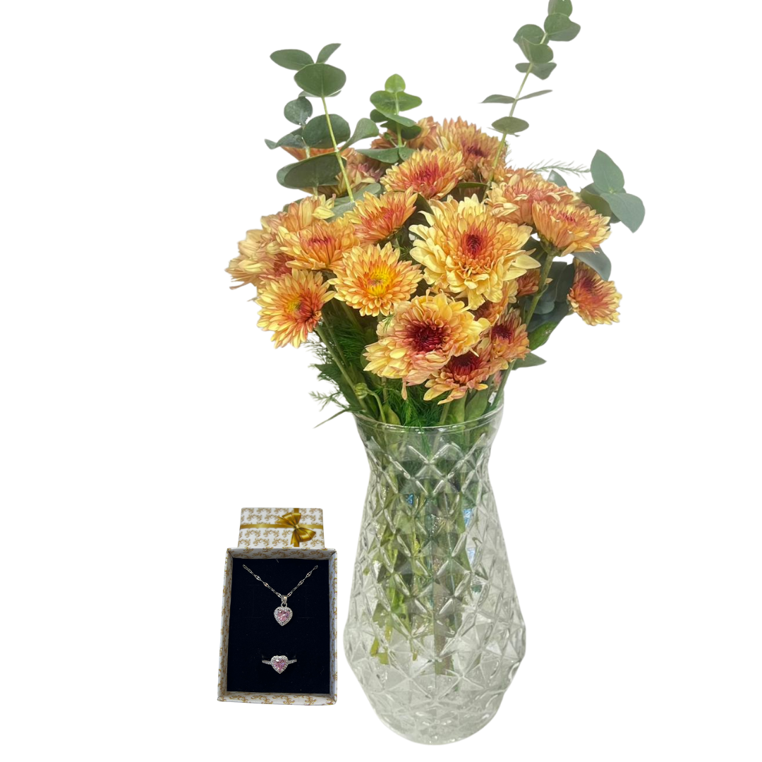 Krem rengi kasımpatının soft ve zarif tonu, okaliptusun ferah yeşilliği ve virgatüsün doğal dokusuyla birleşerek sakin ve estetik bir görünüm sunar. Kristal silindir cam vazo içinde özenle hazırlanan bu aranjman, bulunduğu ortama dinginlik ve sıcaklık katar. Yanına eklenen pembe Pandora kolye ve yüzük seti, sevginin, zarafetin ve romantizmin simgesi olarak tasarıma anlamlı bir dokunuş ekler. Hem romantik hem de şık bir hediye arayanlar için ideal bir seçimdir.