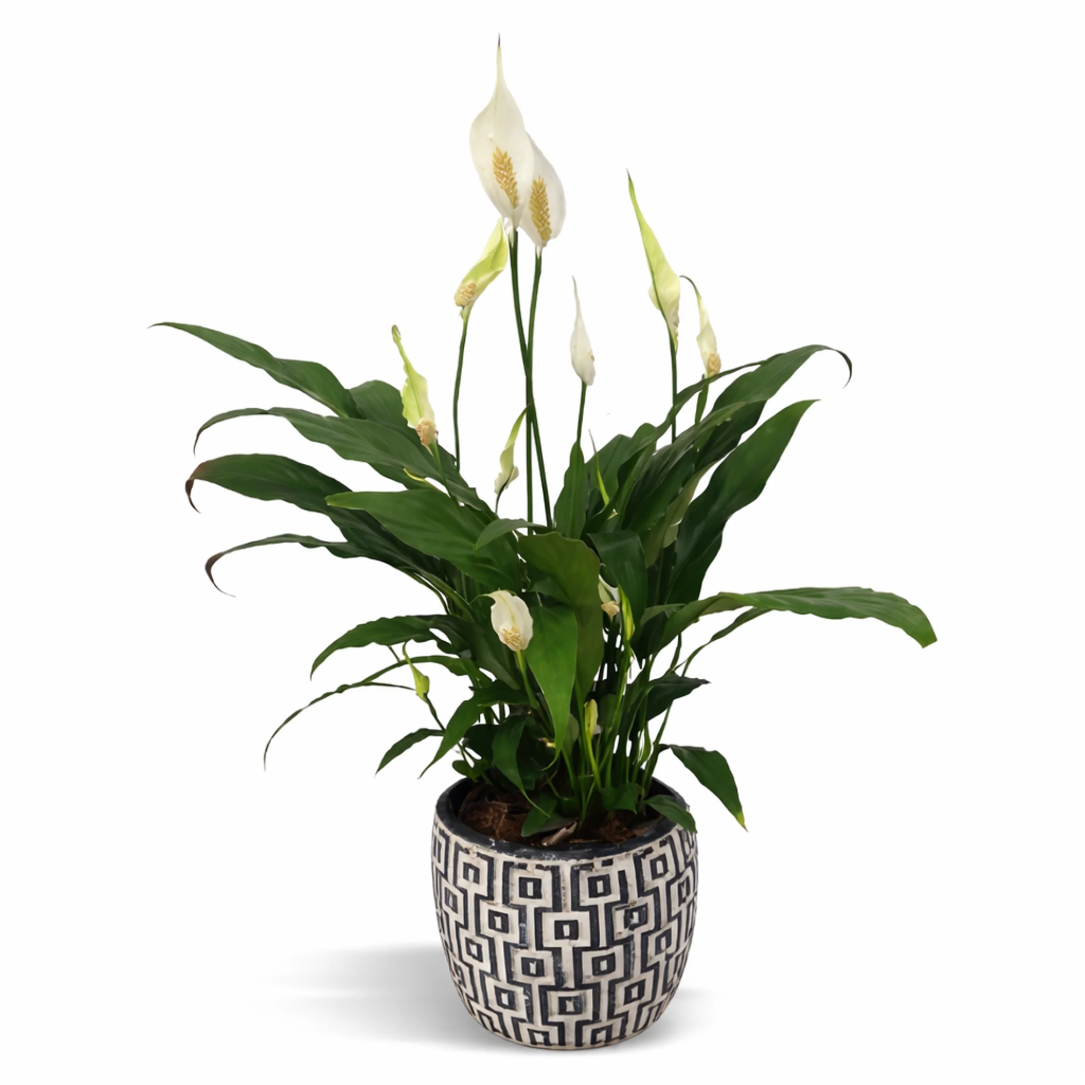 Saksının içinde yer alan barış çiçeği (Spathiphyllum), zarafeti ve dayanıklılığı ile bilinir. Barış çiçeği, parlak yeşil yaprakları ve beyaz çiçekleriyle dikkat çeker. Çiçekler, uzun sapları üzerinde açarak, saksının üst kısmında hoş bir görüntü yaratır. Bu çiçek, barış ve huzur simgesi olarak kabul edilir ve yaşam alanlarına pozitif enerji katmak için idealdir.