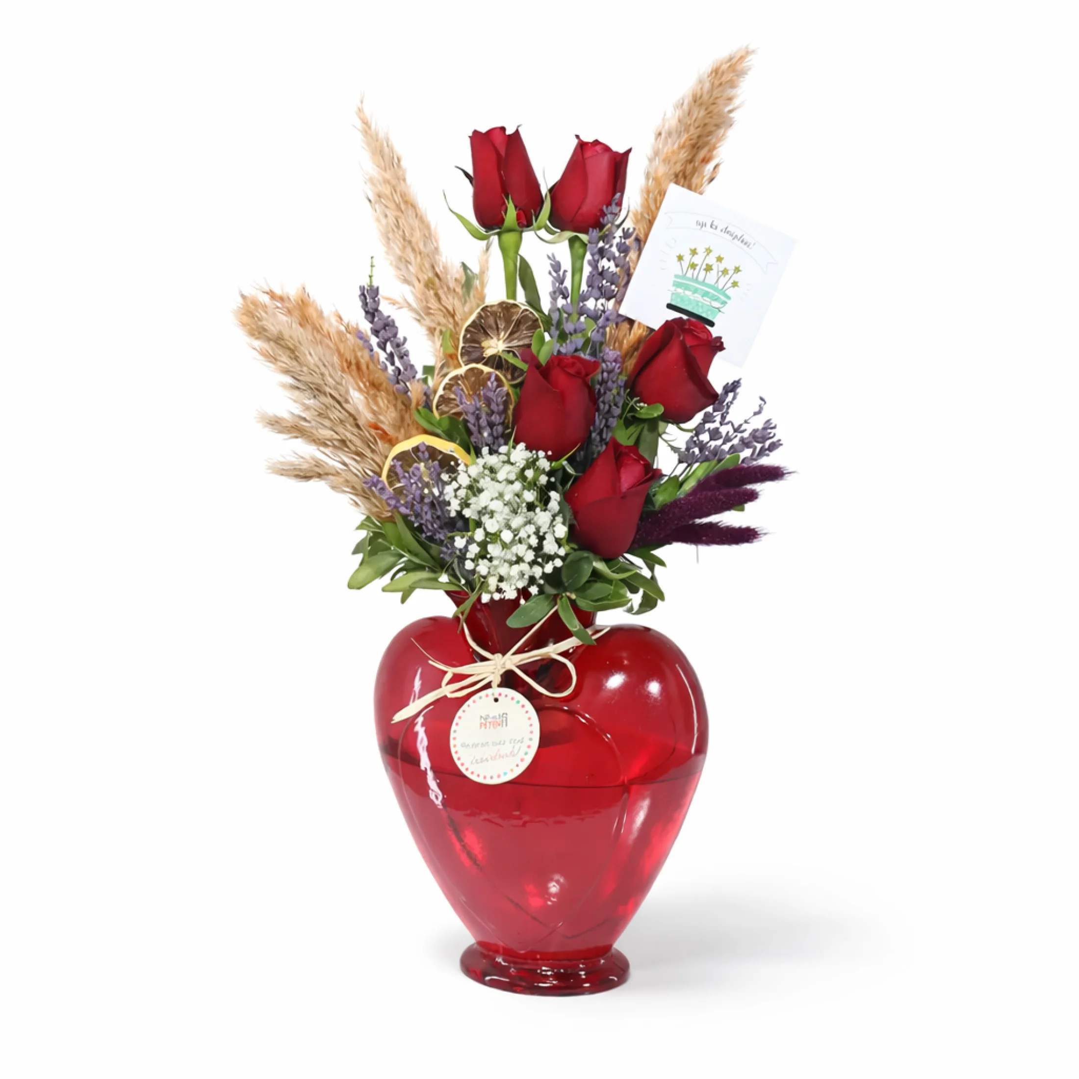 Ürünümüz kırmızı kalp cam vazoda olup, içerisinde 5 adet kırmızı gül, pampas otu, kurutulmuş limon dilimi, lavanta, yeşillik ve cipso ile süslenerek siz değerli müşterilerimiz için Hatay Çiçek Tasarım Ekibimiz tarafından özenle ve sevgiyle hazırlanmıştır...