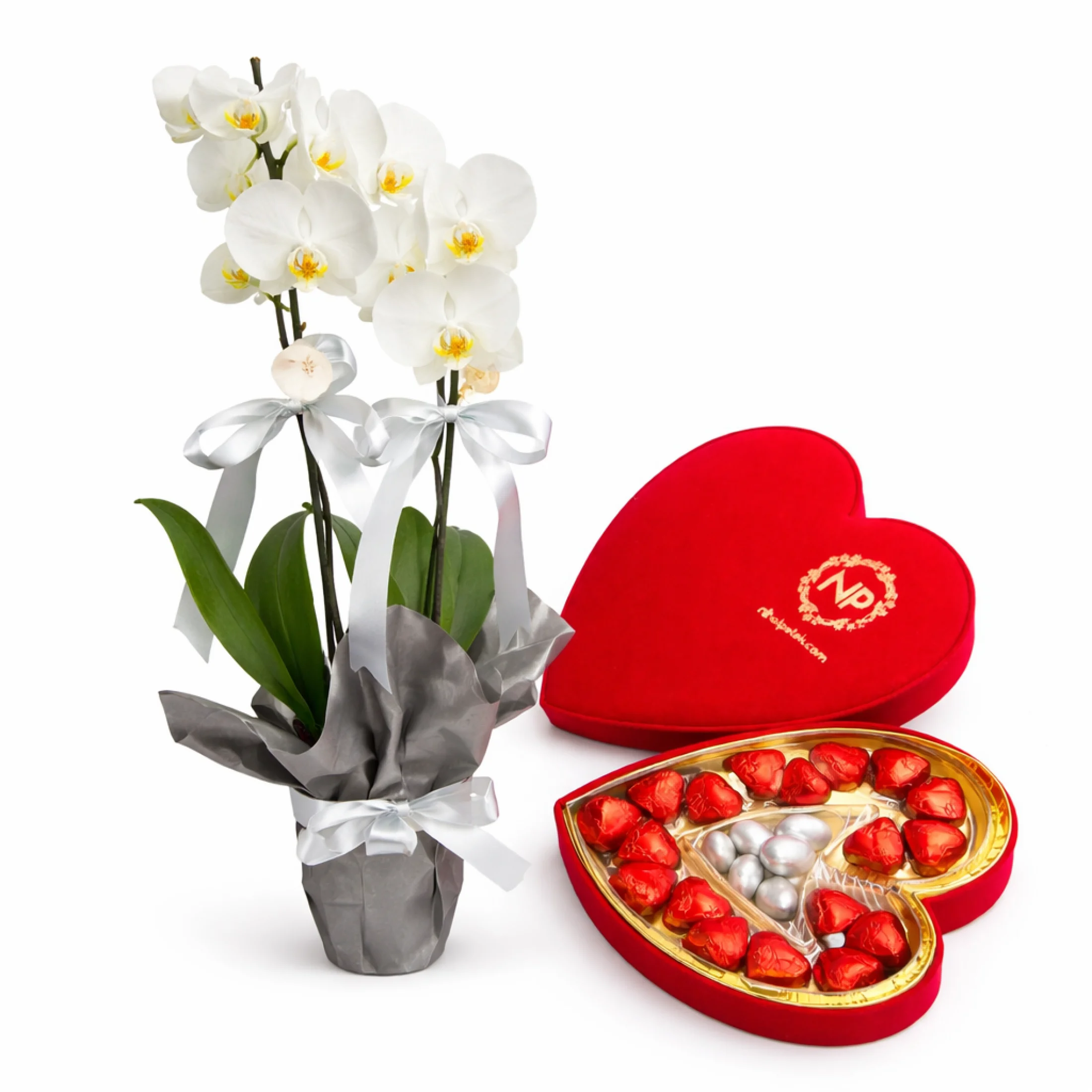 Canlı ve sağlıklı Phalaenopsis orkide; modern gri ambalajı ve saten kurdele detaylarıyla şık bir sunum sağlarken, kırmızı kalp çikolatalar ve özel draje bölümü bulunan kadife dokulu kalp kutu hediyeye romantik ve güçlü bir anlam katar.