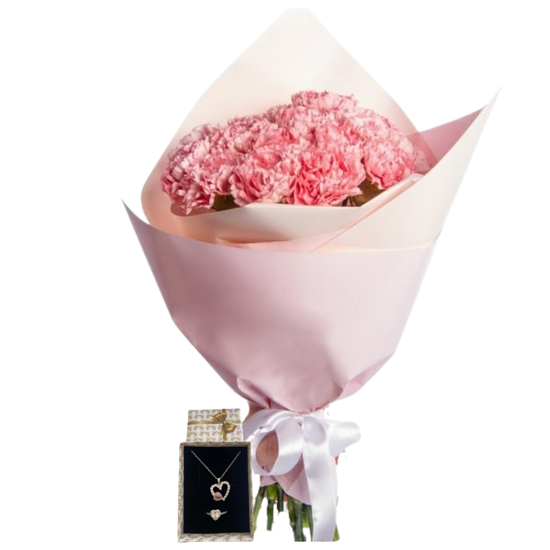 Pembe karanfiller ve mirkeladüs, pembe buket kâğıdının yumuşak dokunuşuyla birleşerek romantik ve zarif bir buket oluşturuyor. Yanında yer alan kalpli kolye ve pandora yüzük, hediyeye anlamlı ve şık bir detay katıyor. Bu aranjman, özel günlerde hem görselliği hem de duygusal değeriyle unutulmaz bir hediye sunuyor.