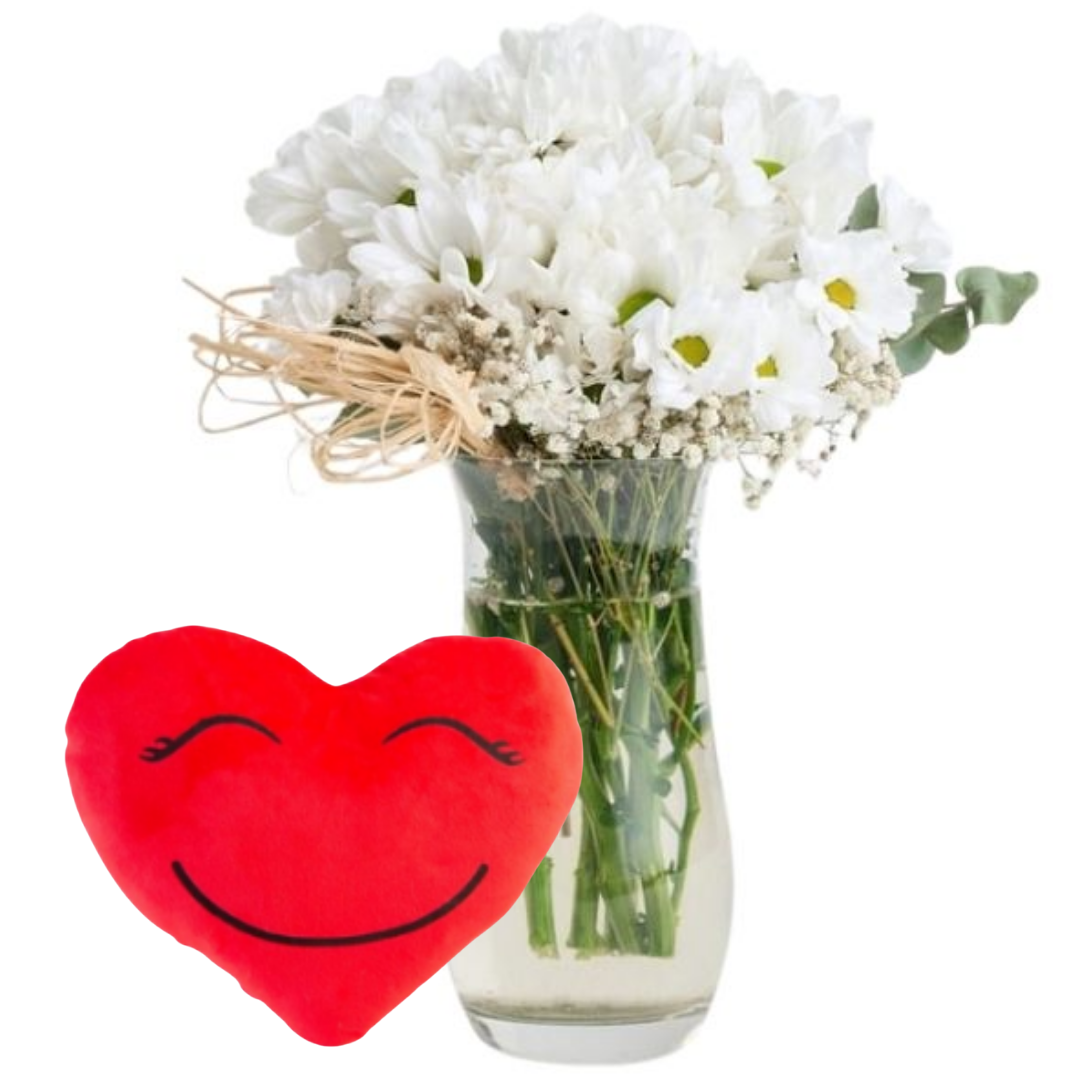 Beyaz papatyaların saflığını ve zarafetini ön plana çıkaran bu özel buket, cipso ve okaliptus yapraklarının doğal dokunuşuyla tamamlanıyor. Silindir cam vazodaki sunumuyla modern ve şık bir görünüm kazanan buket, yanına eklenen kırmızı kalp yastık ile hediyeye sevgi dolu ve samimi bir detay katıyor. Hem göz alıcı hem anlamlı bu kombinasyon, özel günlerde sevdiklerinize unutulmaz bir sürpriz yapmak için ideal bir tercihtir.