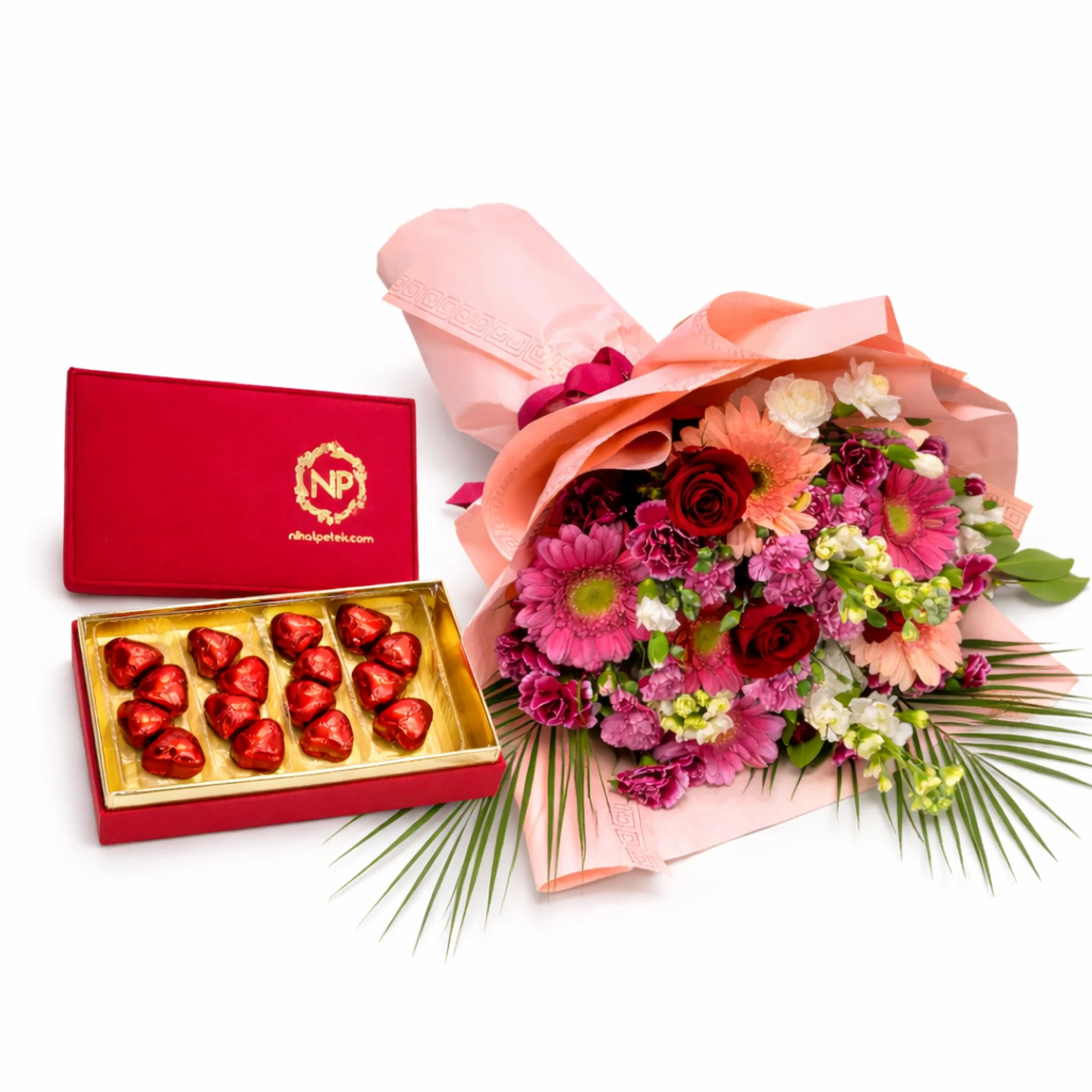 Pembe gerberalar, kırmızı güller ve mevsim çiçekleri ile hazırlanan buket; soft pembe ambalajı ve dekoratif yeşillikleriyle göz alıcı bir görünüm sunar. Yanında bulunan kalp şeklindeki çikolata kutusu ise hediyenize tatlı ve romantik bir dokunuş katar.