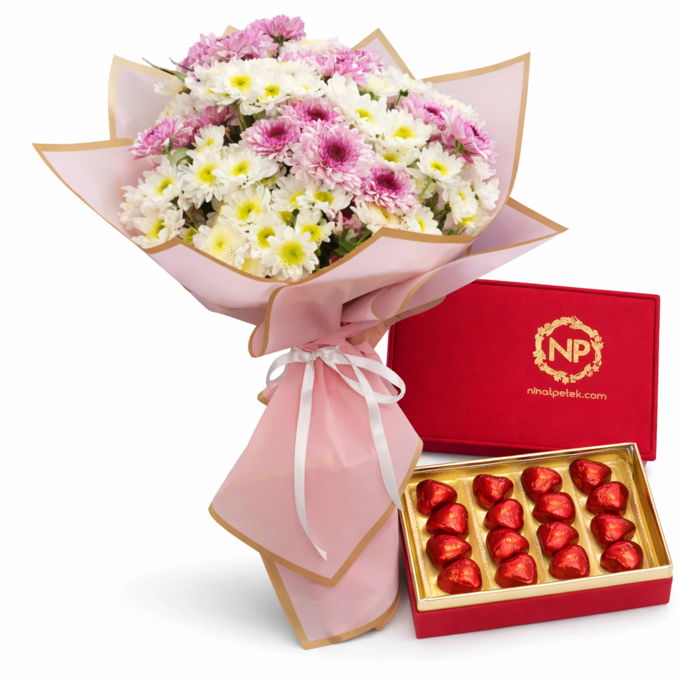 Pembe ve beyaz krizantemlerden oluşan gösterişli ve hacimli buket, gold detaylı pastel pembe ambalaj ile şık bir şekilde hazırlanır. Bukete eşlik eden kırmızı kadife dokulu premium çikolata kutusu ise hediyenize hem lüks hem de tutkulu bir dokunuş katar.