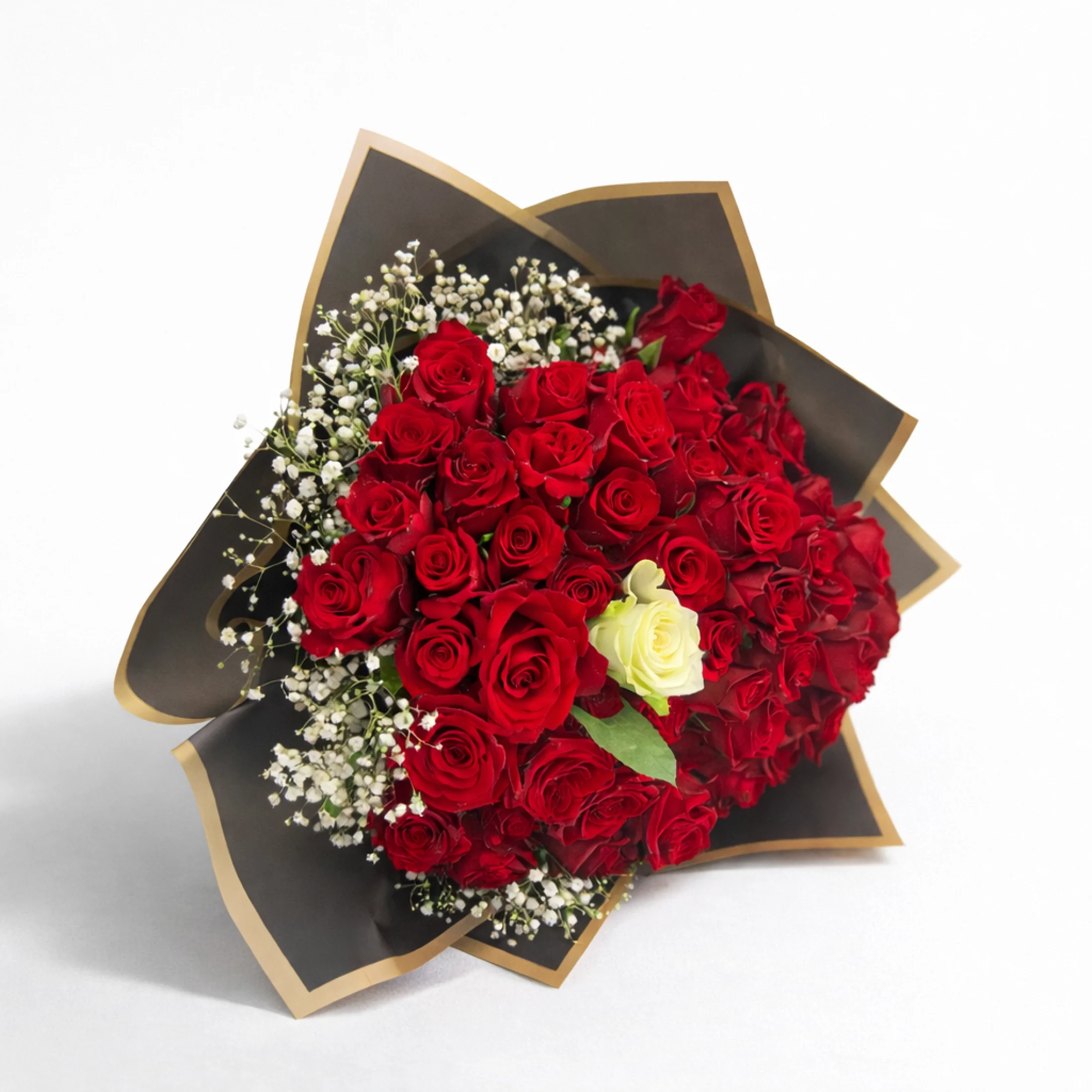 50 kırmızı gül, güçlü sevgiyi, tutkuyu ve bağlılığı temsil ederken; tek beyaz gül, bu büyük sevginin içindeki sadeliği, masumiyeti ve sonsuz güveni anlatır.