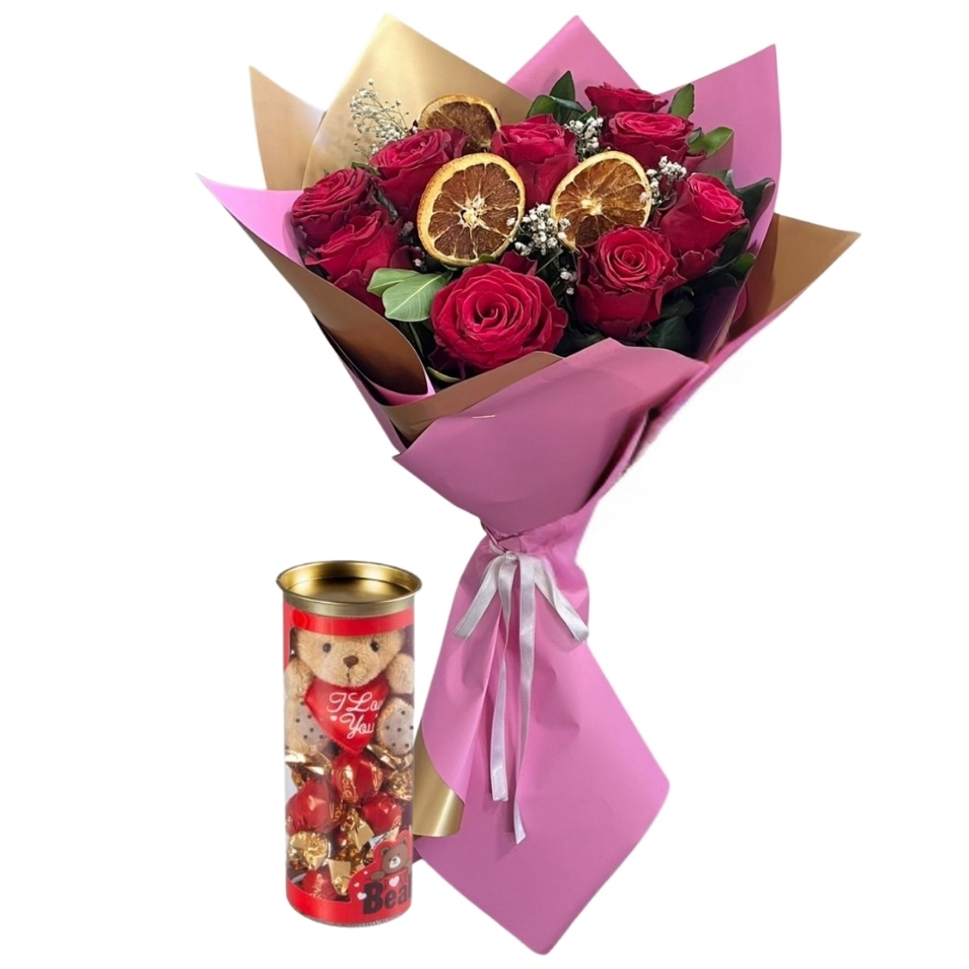 Bu özel tasarımın yanına eklenen silindir kutuda ayıcıklı çikolata, hediyeyi yalnızca görsel bir şölen olmaktan çıkarıp tatlı bir sürprize dönüştürür. Sevimli ayıcık detayı, çikolatanın lezzetiyle birleşerek hediyeyi hem romantik hem eğlenceli bir hale getirir. Duygusal bir anlam taşırken aynı zamanda tatlı bir mutluluk sunmak isteyenler için ideal bir seçimdir.