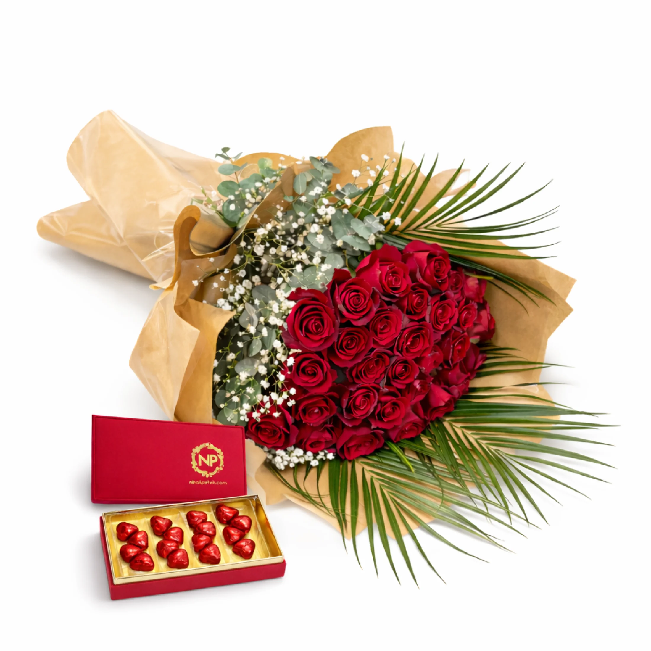 Doğal kraft ambalajla sarılmış buket; okaliptus, cipso ve yeşil dokunuşlarla zenginleştirilerek hem modern hem de romantik bir görünüm kazanır. Canlı kırmızı güller aşkı, tutkuyu ve derin duyguları en güçlü şekilde ifade ederken; yanında yer alan kalp çikolatalar hediyenize tatlı bir anlam katar.
