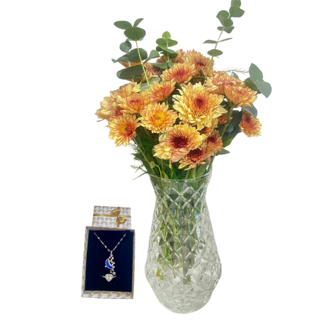 Krem rengi kasımpatının soft ve zarif tonu, okaliptusun ferah yeşilliği ve virgatüsün doğal dokusuyla birleşerek sakin ve estetik bir görünüm sunar. Kristal silindir cam vazo içinde özenle hazırlanan bu aranjman, bulunduğu ortama dinginlik ve şıklık katar. Yanına eklenen ay kolye ve Pandora yüzük seti, romantizmin ve huzurun simgesi olarak tasarıma anlamlı bir dokunuş ekler. Hem özel hem de zarif bir hediye arayanlar için ideal bir seçimdir.