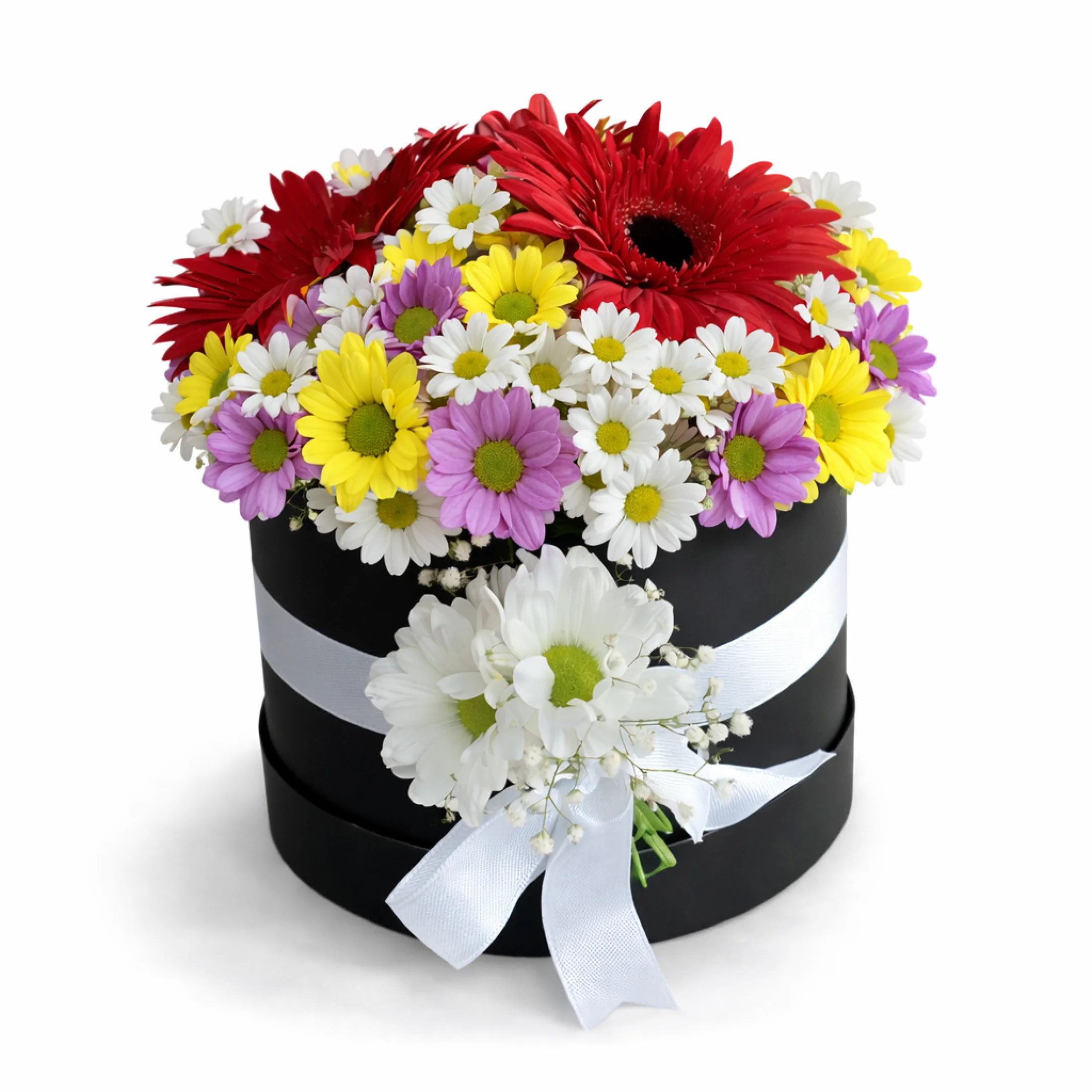 Mutluluğum PapatyaYaklaşık 20-25 cm yüksekliğinde siyah yuvarlak kutu içerisine tanzim edilmiş renkli papatya çiçekleri ile kırmızı gerbera çiçekleri aranjmanımız sizler için özel olarak tasarlandı.