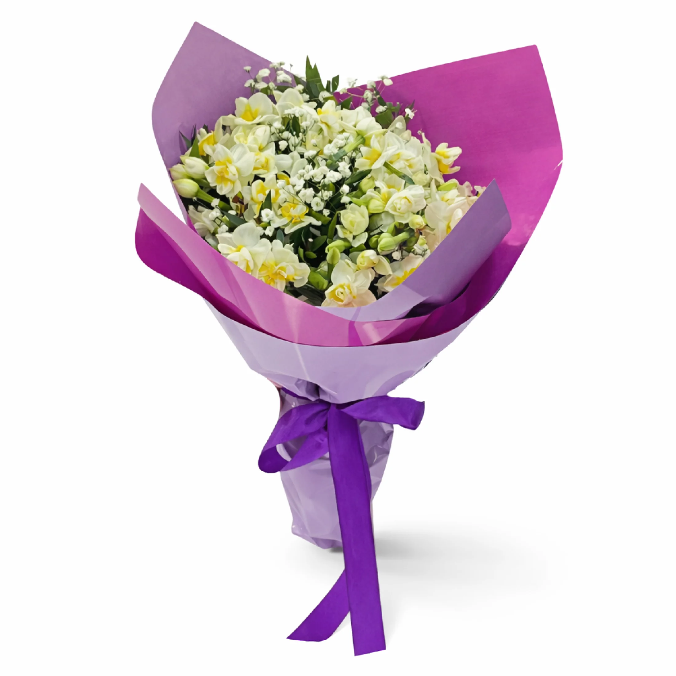 Lila Nergis DokunuşuSevgi, zarafet ve özenle tasarladığımız mor lila renkli buket kağıdında bulunan nergis çiçekleri, duygularınıza hitap eden muhteşem bir deneyim sunuyor. Bu eşsiz çiçek buketi,siz değerli müşterilerimiz için özel olarak hazırlandı.