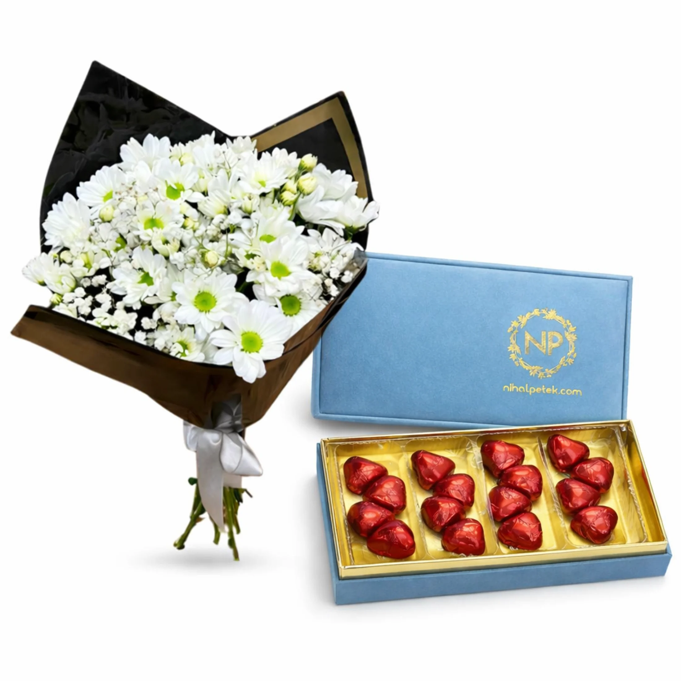 Siyah ve gold detaylı ambalajla hazırlanan beyaz papatya buketi, premium mavi kutuda sunulan kalp çikolatalarla birlikte romantik ve zarif bir hediye seti oluşturur.