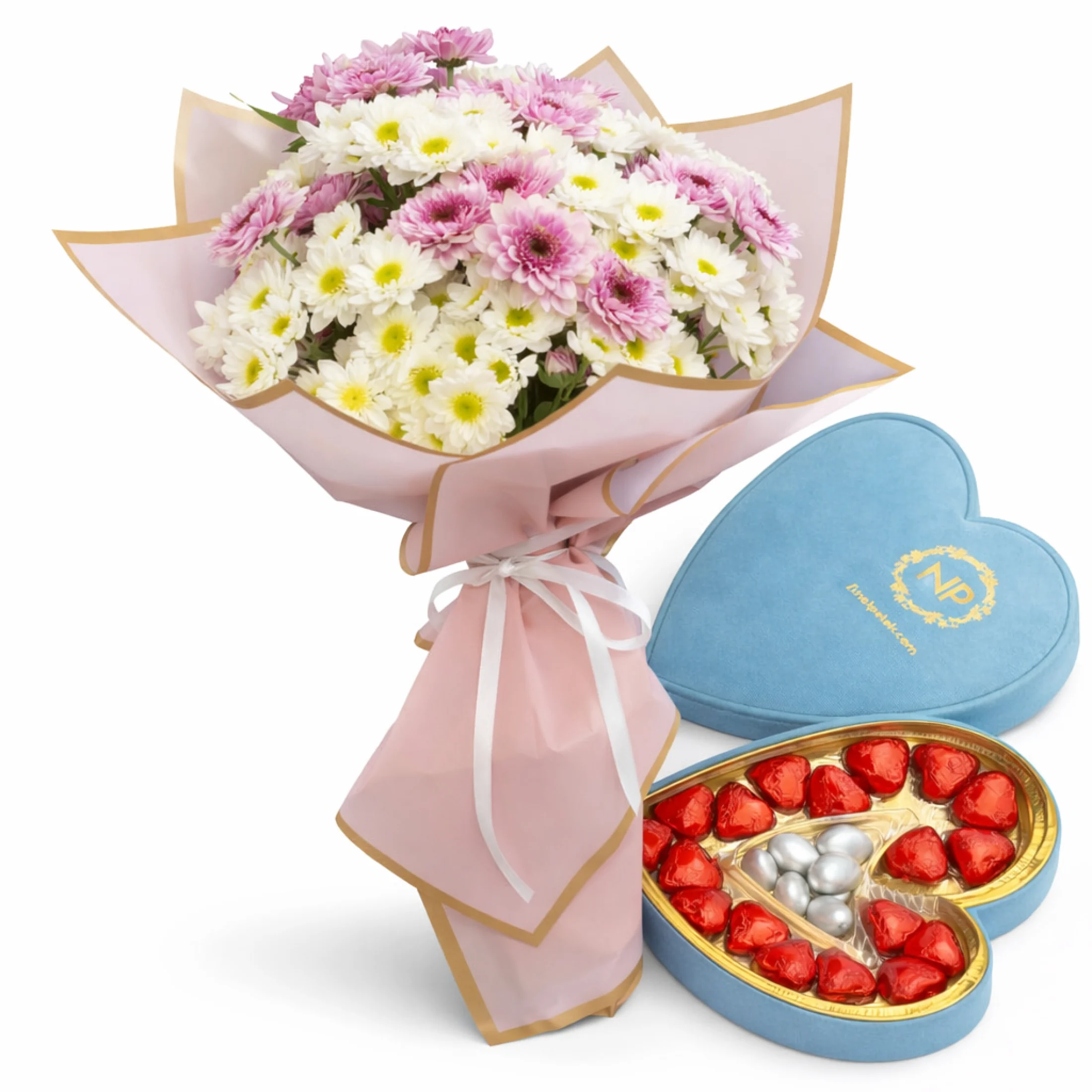 Pembe ve beyaz krizantemlerden oluşan gösterişli buket, mavi kadife kalp formunda premium çikolata kutusu ile bir araya getirilerek şık ve farklı bir hediye setine dönüştürüldü.