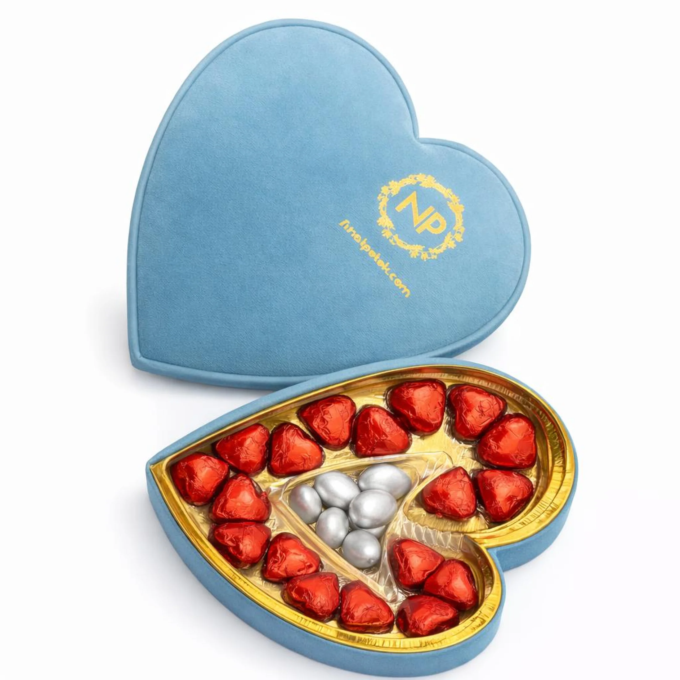 Zarif ve sofistike tasarımıyla öne çıkan Mavi VIP Kalp Çikolata Kutusu, kadife dokulu mavi kalp formu ve gold detaylı iç tasarımıyla premium bir hediye deneyimi sunar. İçerisinde özenle yerleştirilmiş kırmızı kalp çikolatalar ve özel drajeler bulunur.