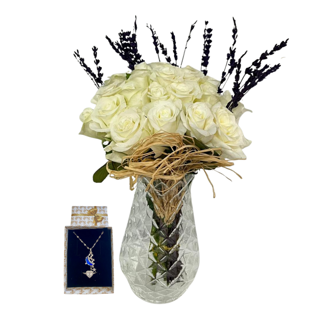 Beyaz gülün zarafeti ile lavantanın huzur veren kokusu kristal silindir vazo içinde buluşarak sade, temiz ve asil bir görünüm oluşturur