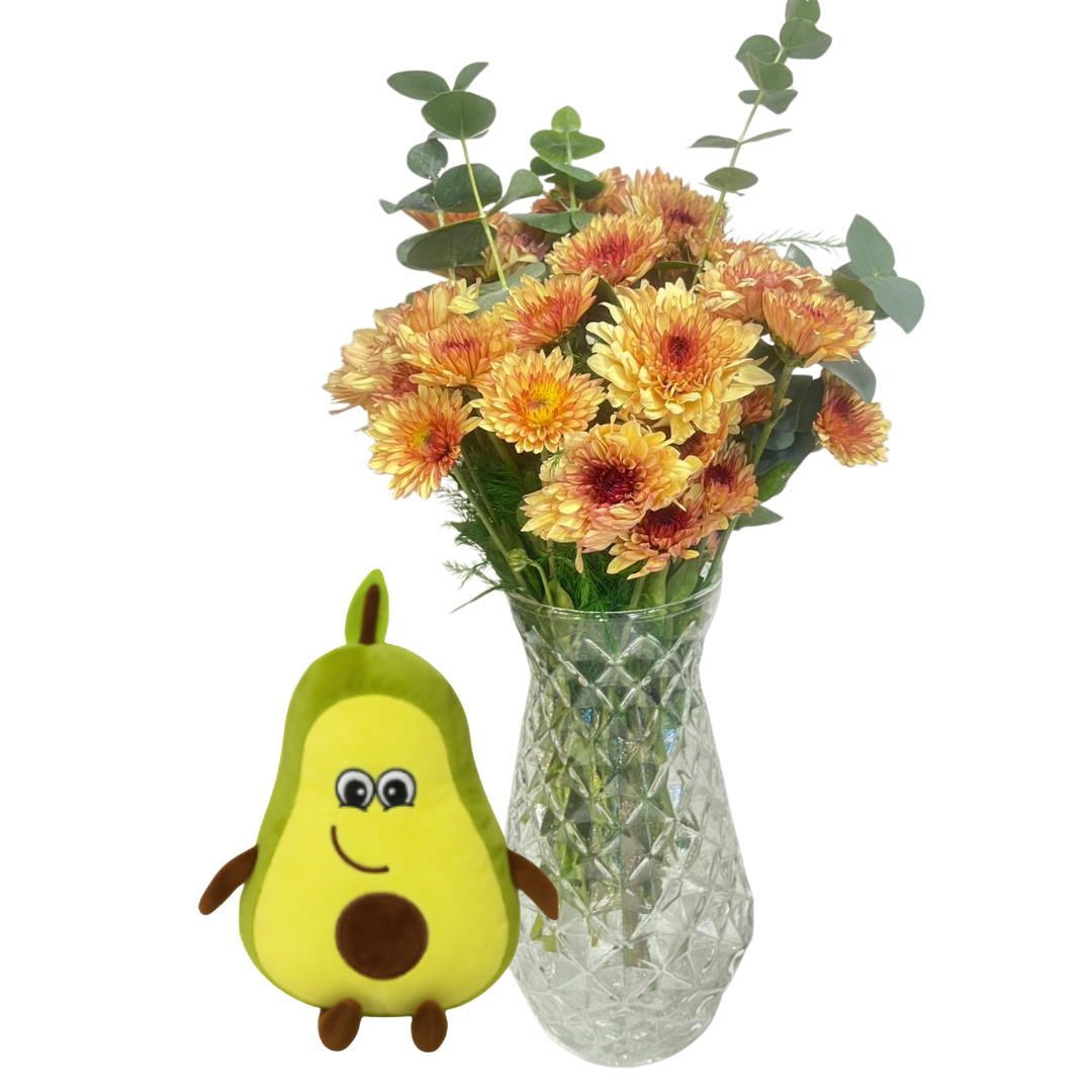 Krem rengi kasımpatının soft ve zarif tonu, okaliptusun ferah yeşilliği ve virgatüsün doğal dokusuyla birleşerek sakin ve estetik bir görünüm sunar. Kristal silindir cam vazo içinde özenle hazırlanan bu aranjman, bulunduğu ortama dinginlik ve sıcaklık katar. Yanına eklenen sevimli peluş avokado, tasarıma eğlenceli ve samimi bir dokunuş ekler. Hem neşe hem de sevdiklerinize anlamlı bir hediye sunma imkanı sağlar.