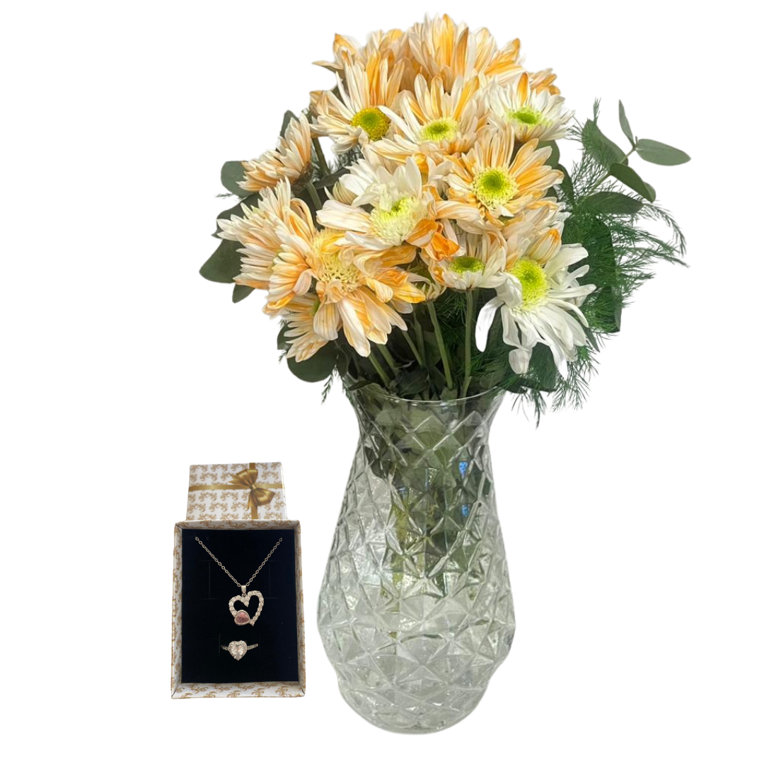 Turuncu kasımpatının sıcak enerjisi, okaliptusun taze yeşilliği ve virgatüsün zarif dokusuyla birleşerek içten bir doğallık sunar. Kristal silindir cam vazo içinde özenle düzenlenen bu zarif aranjman, canlı renkleriyle pozitif enerji yayar. Yanında yer alan kalpli kolye ve Pandora yüzük seti, sevginin, bağlılığın ve zarafetin en anlamlı sembolüdür. Hem duygusal hem estetik bir hediye olarak dikkat çeken bu tasarım, sevdiklerinize kalpten gelen bir mutluluk armağan eder.