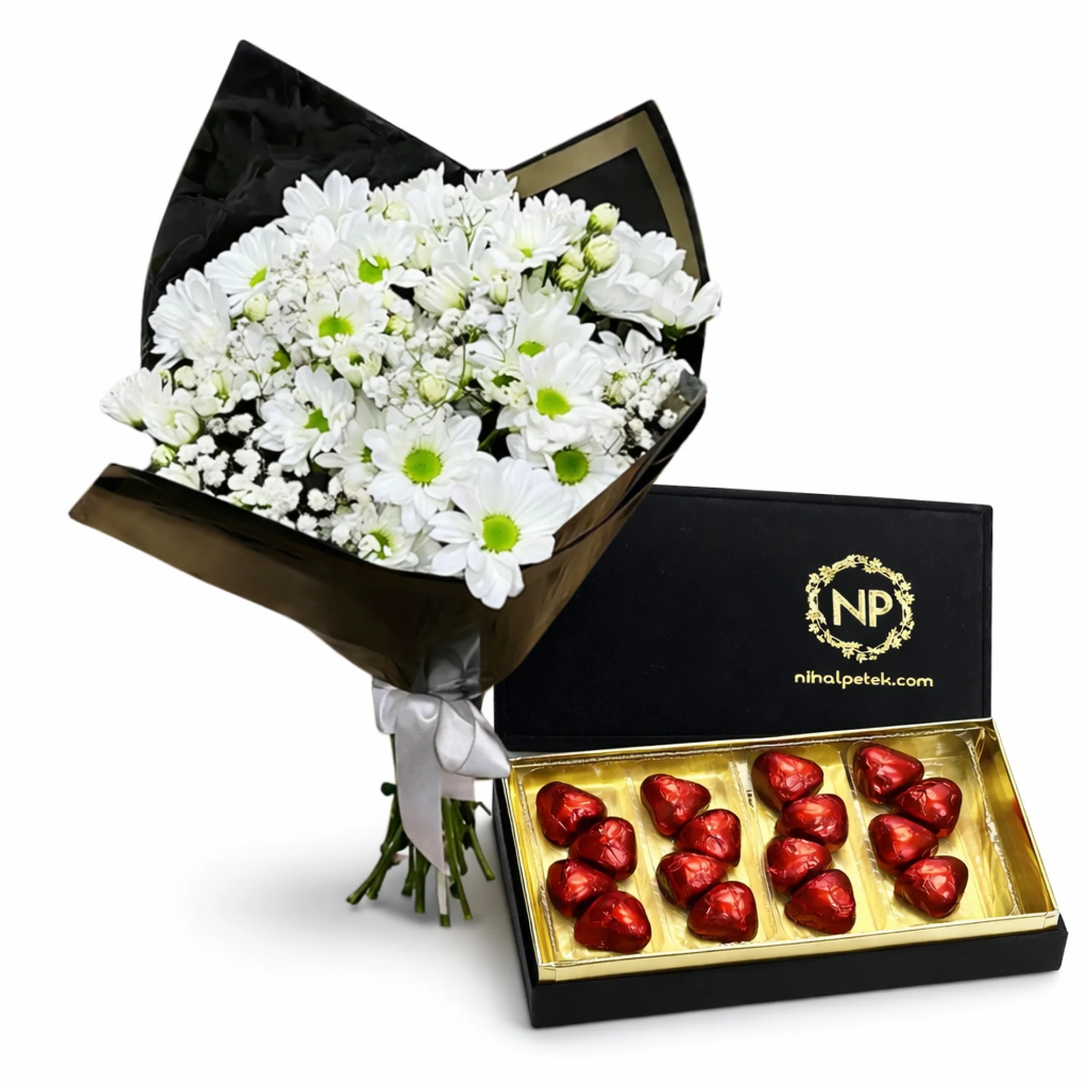 Beyaz papatyaların masum zarafeti ve kalp formunda premium çikolataların tatlı sürprizi bir arada! Siyah şık ambalajlı papatya buketi, taze cipso detaylarıyla hazırlanmış olup formu korunarak modern bir tasarım sunar. Yanında yer alan NP özel tasarım kutusunda kalp çikolatalar ise hediyenize romantik bir dokunuş katar.