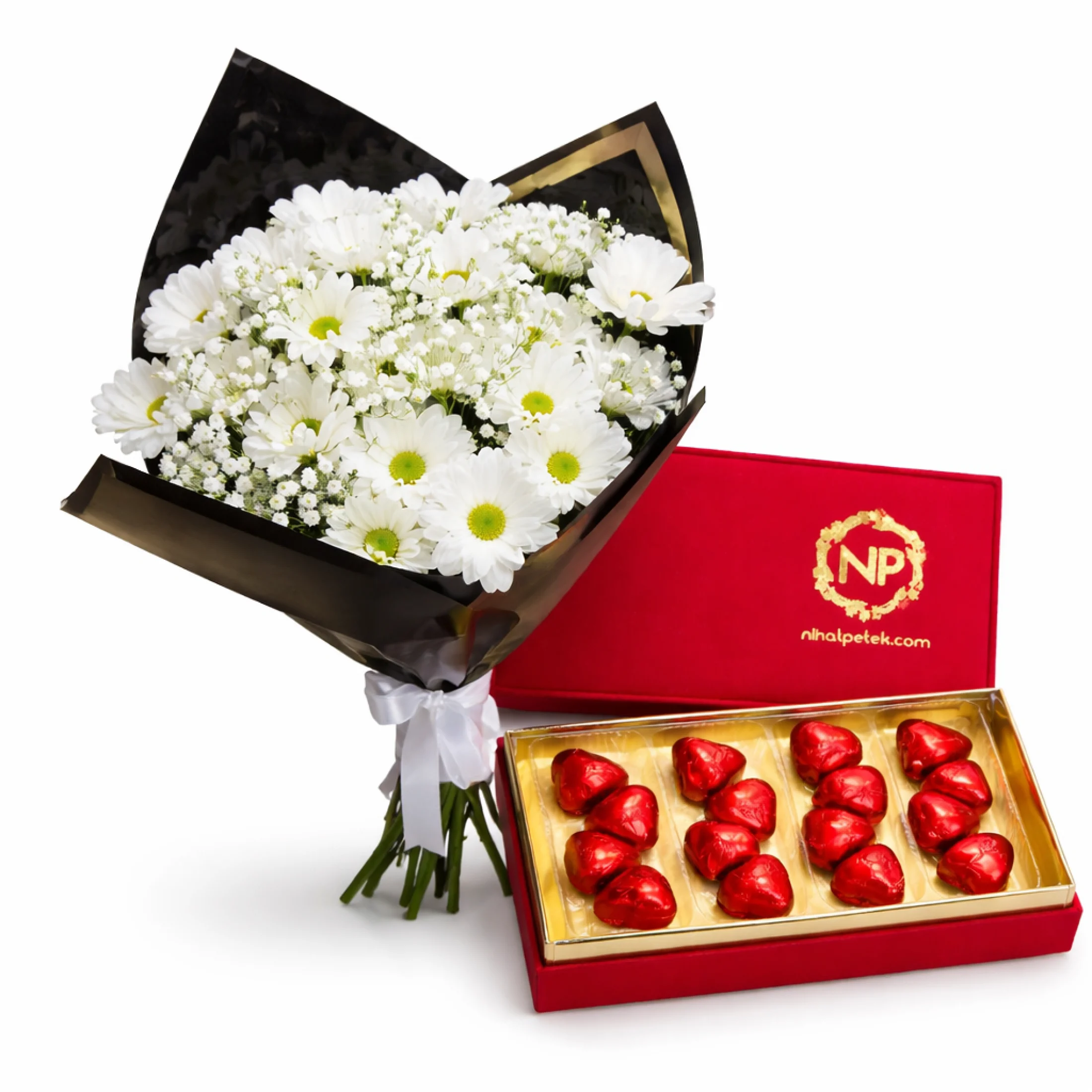 Beyaz papatyaların zarif ve saf görünümü, kırmızı premium kalp çikolata kutusunun romantik şıklığıyla buluşuyor. Siyah gold detaylı buket ambalajı ile modern ve güçlü bir tasarım sunarken, kırmızı kadife dokulu özel NP çikolata kutusu hediyenize lüks bir dokunuş katar.